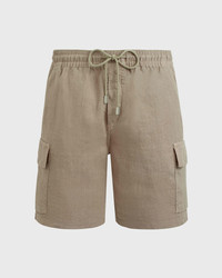As the perfect embodiment of casual elegance and the spirit of Saint-Tropez, these Baie men's Bermuda shorts feature charming overdyed linen for Vilebrequin's own brand of casual chic. Keep your holiday on track with the Baie Man Bermuda shorts. With a casual design and cargo pockets, these soft and comfortable linen Bermuda shorts are perfect for any trip. On the beach with flip-flops, in the city with a T-shirt or paired with a shirt for a casual evening out, it's the perfect choice for summer. - Relaxed men bermuda short - Two italian pockets and two cargo pockets on sides - One back pocket with a flap - Elastic waistband with tone on tone drawstring and metal tips - Bottom leg width in size M: 11.42" - Side length in size M: 19.29" - Men Bermuda Shorts - Solid men Bermuda Shorts - 100% Linen