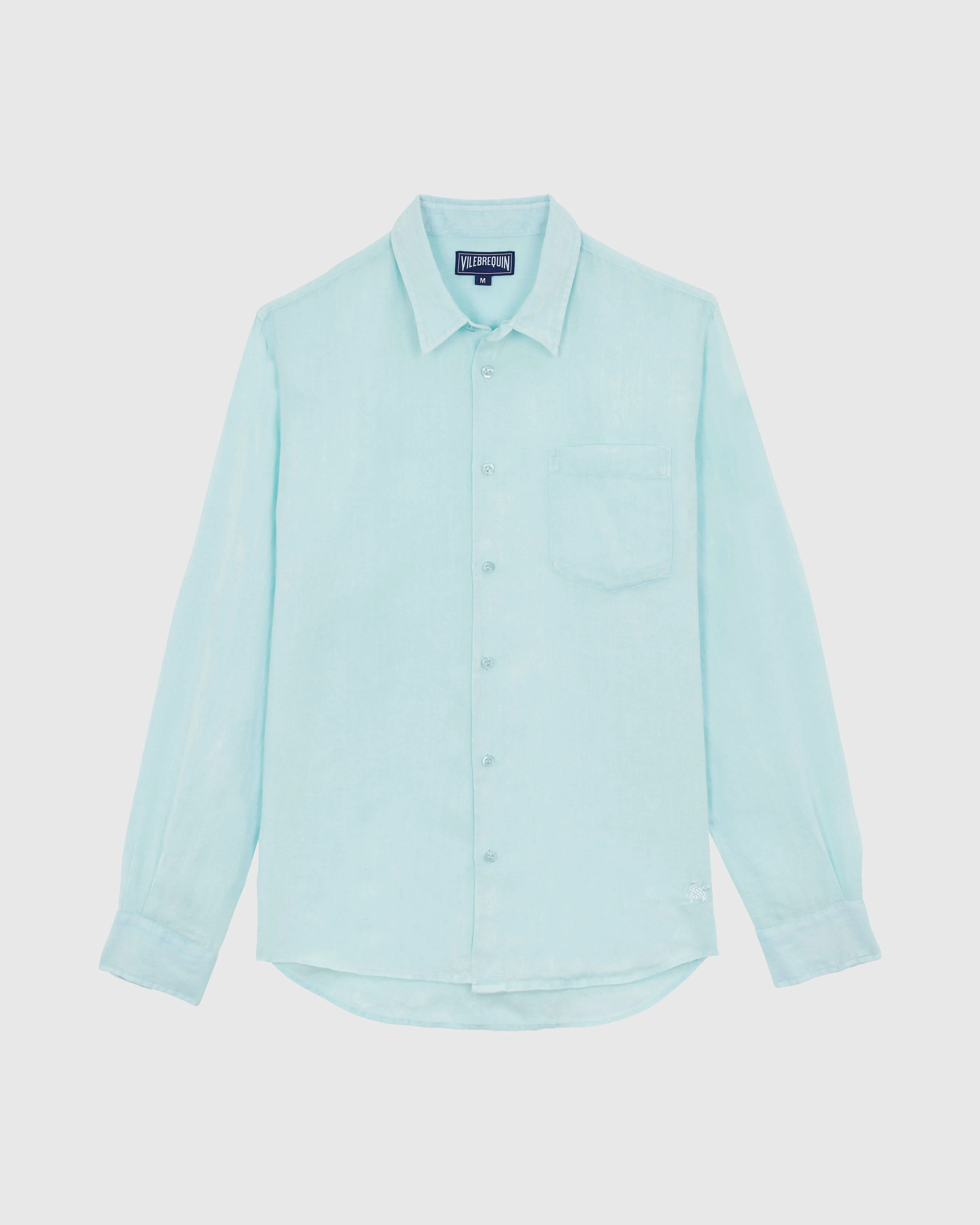 Cover up in style in this sophisticated linen overshirt that doubles as a summer jacket. The iconic tone-on-tone embroidered turtle on the left hip offers a subtle enhancement. - Relaxed fit button down Linen shirt for women - Natural dye color - Long Sleeve - Chest pocket - Tone on tone embroidery turtle Logo on left hip - The model is 6'0.83" and wears a M size - Men Shirt - Men Shirt Natural dye - 100% linen Product Information Style: Caroubis Model: CRSCU103-315 Color: PACIFIC / BLUE