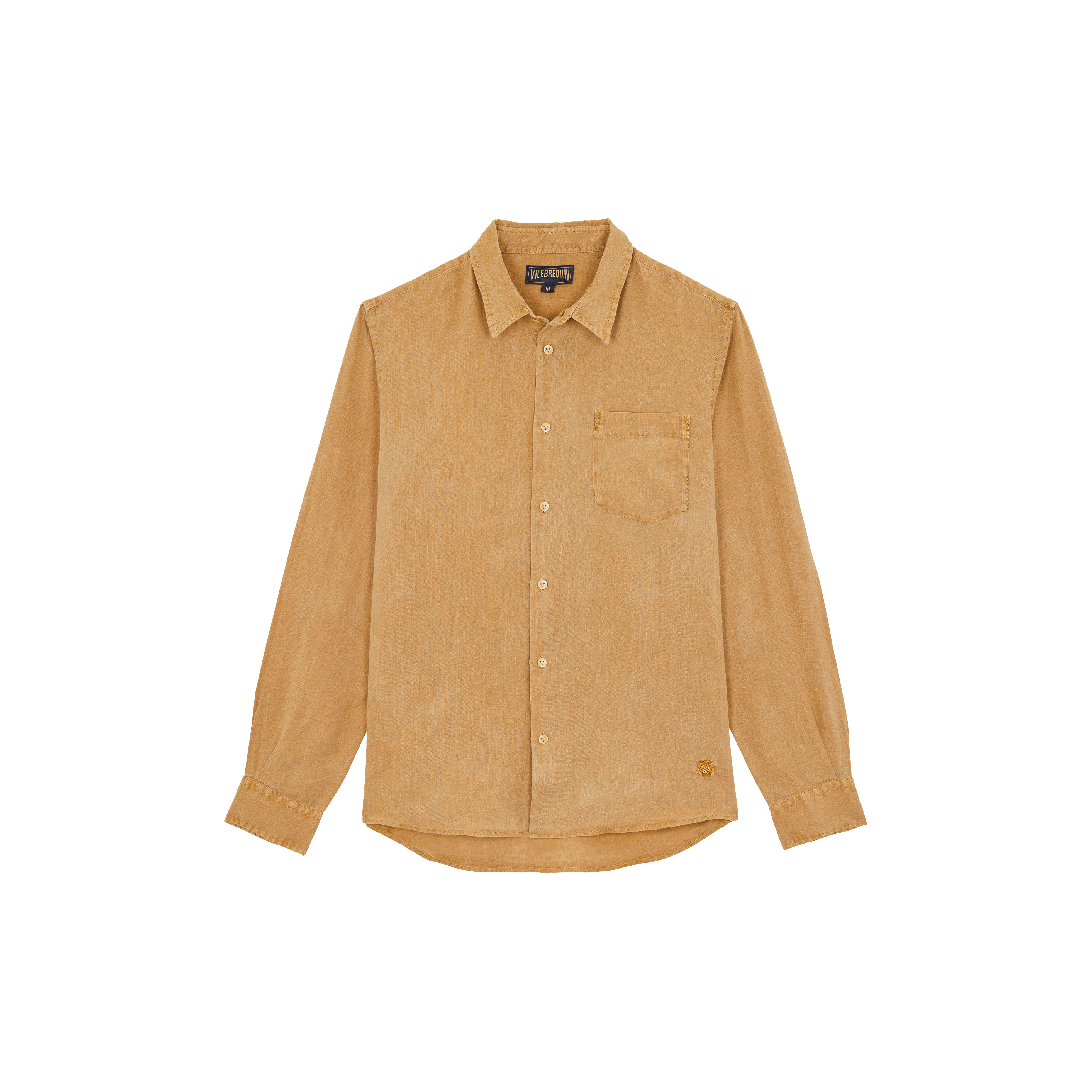 Cover up in style in this sophisticated linen overshirt that doubles as a summer jacket. The iconic tone-on-tone embroidered turtle on the left hip offers a subtle enhancement. - Relaxed fit button down Linen shirt for women - Natural dye color - Long Sleeve - Chest pocket - Tone on tone embroidery turtle Logo on left hip - The model is 6'0.83" and wears a M size - Men Shirt - Men Shirt Natural dye - 100% linen Product Information Style: Caroubis Model: CRSCU103-520 Color: MOCHA / BROWN