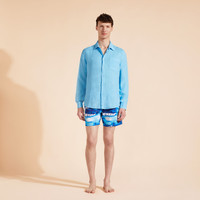 The most casual of dress shirts. A paragon of nonchalant elegance, the Caroubis men's linen shirt exudes timeless charm and Mediterranean mellowness. A men’s linen shirt that guarantees elegance in every circumstance - Men’s shirt featuring a classic French collar - Men’s shirt with chest pocket - Vilebrequin turtle embroidered tone-on-tone on the bottom of this men’s shirt - uni Men’s shirt An incredibly comfortable men’s linen shirt - Men’s shirt in linen, the ideal thermoregulating material for intense heat - Straight-cut, relaxed-fit, long-sleeved men’s linen shirt. Chest measurement in size M: 97 to 101 cm A long-sleeved linen shirt designed to look fresh through the years - From the thread to the buttons, this men’s linen shirt is designed to last through the years. - Model wears size M - Model measurements: Height 73.6”, Bust 41.3”, Waist 33”, Hips 37.4” Composition of the Caroubis men’s shirt: - 100% Linen Product Information Style: Caroubis Model: CRSH9U10-600 Color: SANTORINI / BLUE