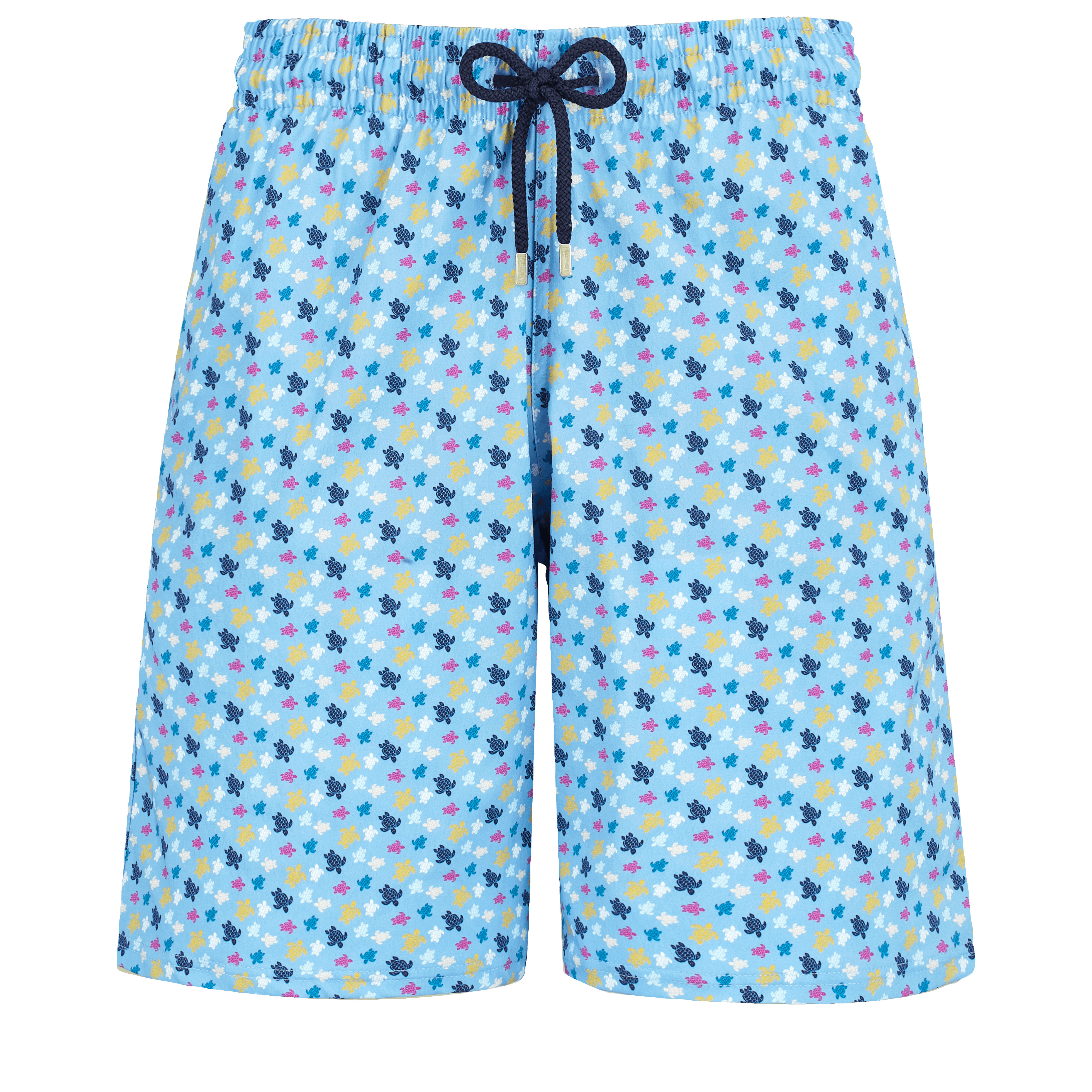 Graphic and playful, these Okorise stretch trunks take you into a rainbow-coloured underwater world. Dive among the miniature turtles, because adventure awaits you. - Long stretch Swim Trunks for Men with elastic waistband with drawstring and Zamac tips engraved Vilebrequin - Men Swim Trunks with Side pockets - Back pocket with Velcro flap - No ballooning thanks to two eyelets at the back of the Swimwear - Hand-placeMent of back pocket for perfect visual alignMent with Swimwear print - Side leg length in size M: 19" - Inseam for size M: 8" - Men Swim Trunks - Men Swim Trunks Micro Ronde Des Tortues Rainbow - Model wears size M - Model measurements: Bust 37.4”, Height 72.8”, Waist 29.5”, Hips 36.6” - 98% Recycled Polyamide - 2% Elastane