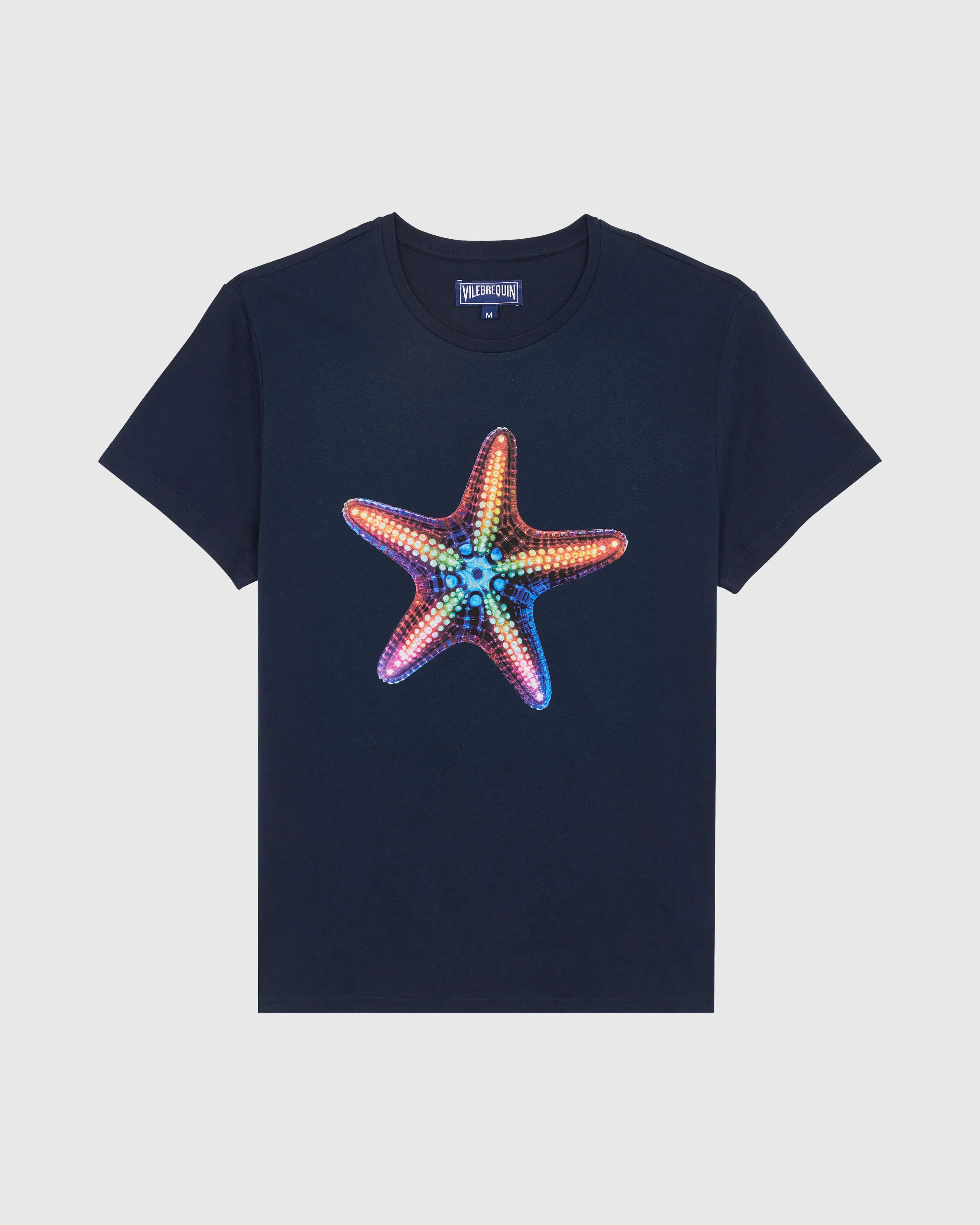Brighten the day with this colourful disco starfish print t-shirt in organic cotton. The star print features on the front and back to make an impact. - Men cotton Jersey Round neck T-shirt - Vilebrequin printed Starfish pattern - Back printed Starfish - Two eyelets - Middle back length: 26.77" - The model is 6'2.41" and wears a M size - Men T-shirt - Men T-shirt Disco Stars - 100% organic cotton Product Information Style: Thom Model: THOCP307-390 Color: NAVY / BLUE