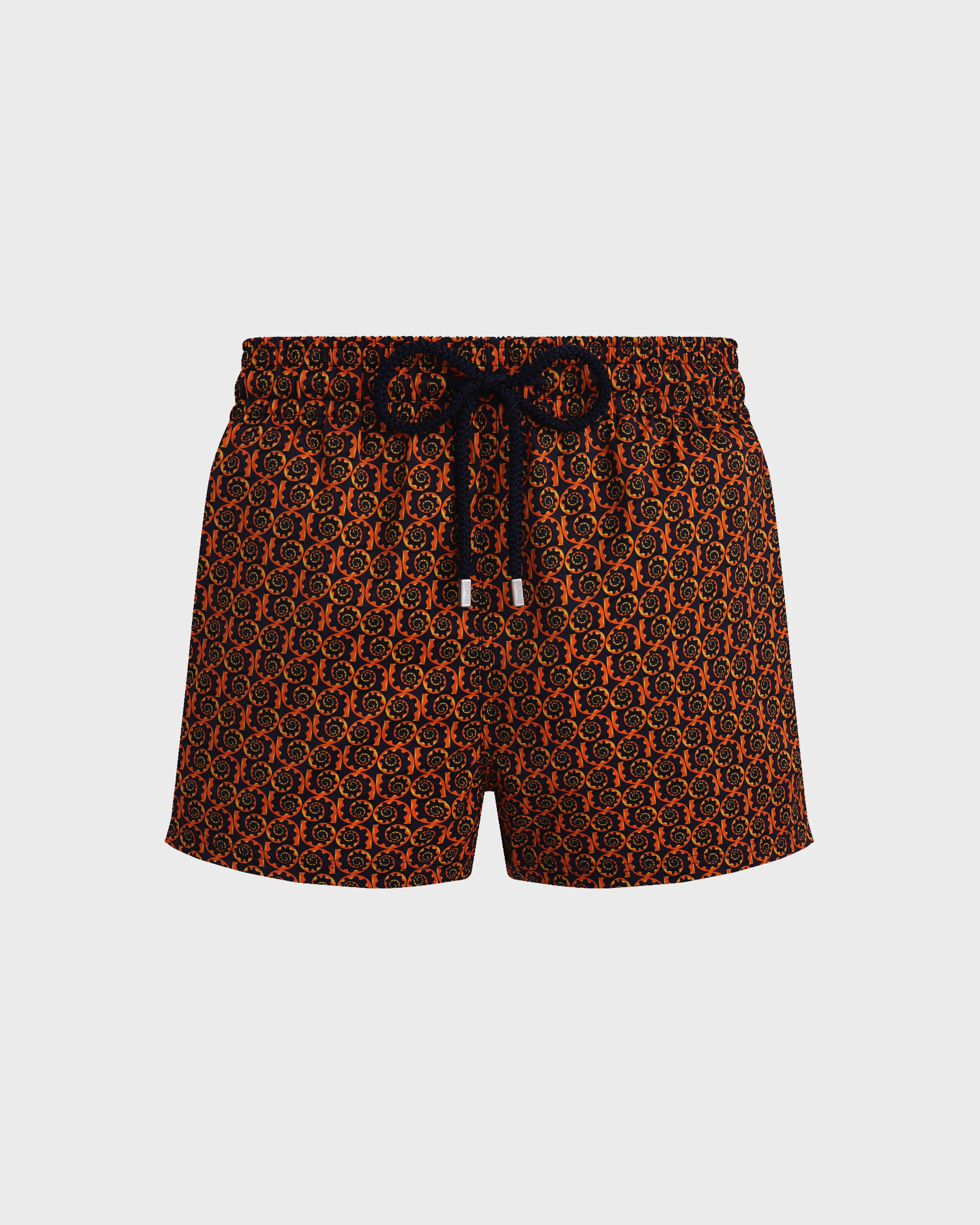 A timeless pair of men's short swim shorts formed from stretch recycled polyester and elastane. The Vilebrequin-tipped drawstring ensures a comfortable fit while the iconic logo completes the detail. - Short printed swim shorts - Elastic waistband - Drawstring, zamac tips engraved Vilebrequin - Side pockets - Side leg length in M: 31 cm - Men Swim shorts - Men Swim shorts Graphic Wrinkles - 98% recycled polyamide 2% elastane Product Information Style: Manta Model: MTACF524-390 Color: NAVY / BLUE