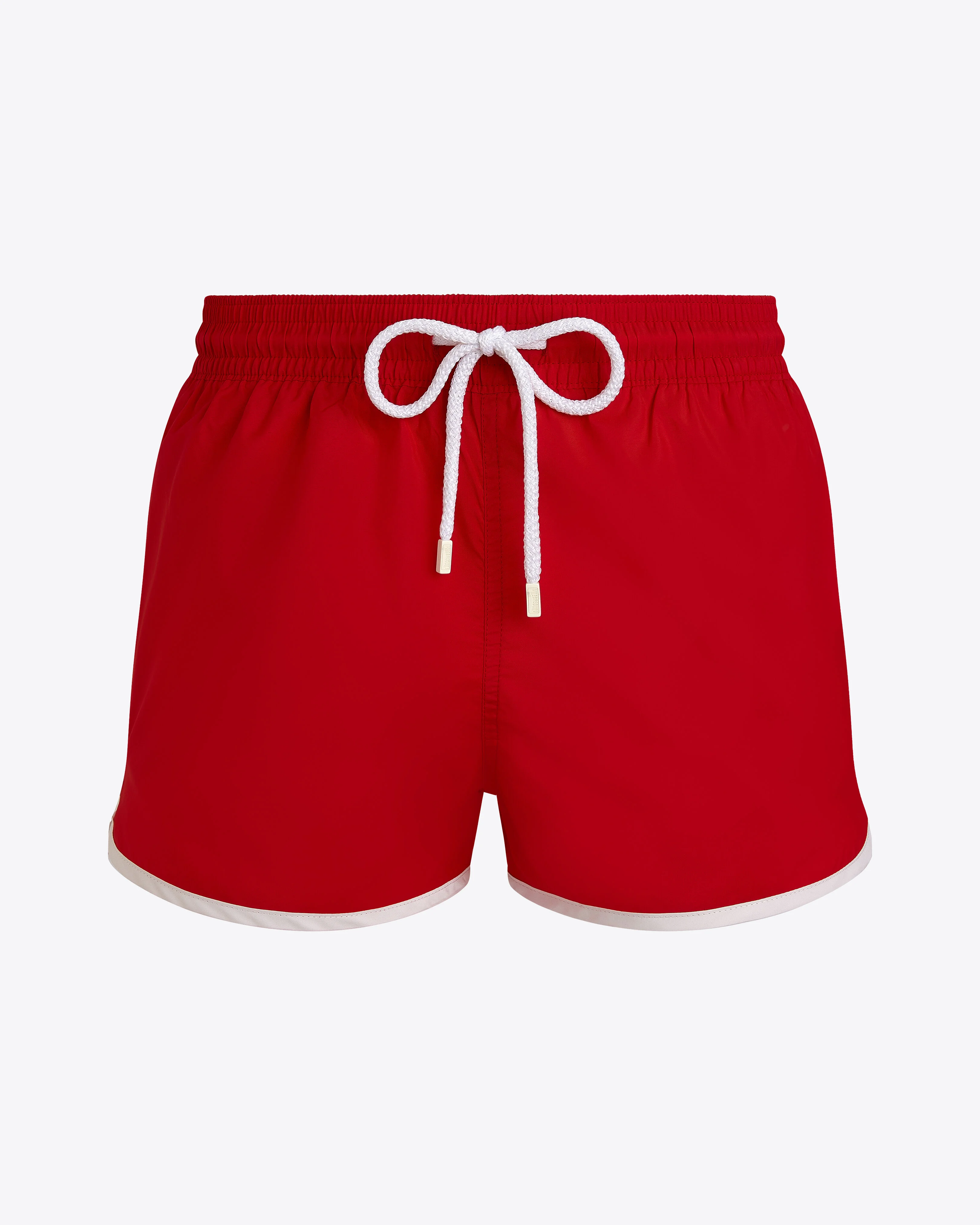 Crafted from ultra-light recycled polyester and featuring a drawstring and elasticated waist for comfort, these men's swim shorts feature the iconic Vilebrequin logo and initials on the back. - Men swimsuit made from ultra-light material - Elastic waistband with a white contrasting drawstring - White turtle embroidery on the front - White VBQ signature embroidery on the back patch pocket - Eyelets at the back to prevent a ballooning effect - Inner mesh swim brief made of 100% recycled polyamide - The model is 6'2.41" and wears a M size - Men Swim trunks - Men Swim shorts Solid - 100% recycled polyester Product Information Style: Meno Model: MENAI100-201 Color: POPPY RED / RED