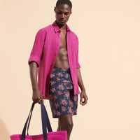 If you want to save Polynesian turtles, throw them flowers. The half-floral, half-animal motif on these Okorise men's long stretch trunks preserve the seabed through the Vilebrequin Foundation, which supports the Te Mana O Te Moana association. - Long stretch Swim Trunks for Men with elastic waistband with drawstring and Zamac tips engraved Vilebrequin - Men Swim Trunks with Side pockets - Back pocket with Velcro flap - No ballooning thanks to two eyelets at the back of the Swimwear - Hand-placeMent of back pocket for perfect visual alignMent with Swimwear print - Side leg length in size M: 19" - Inseam for size M: 8" - Men Long Swim Trunks - Men Swim Trunks Provencal Turtles - Model wears size M - Model measurements: Bust 38.9”, Height 73.6”, Waist 29.5”, Hips 37.4” - 98% Recycled Polyamide - 2% Elastane