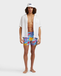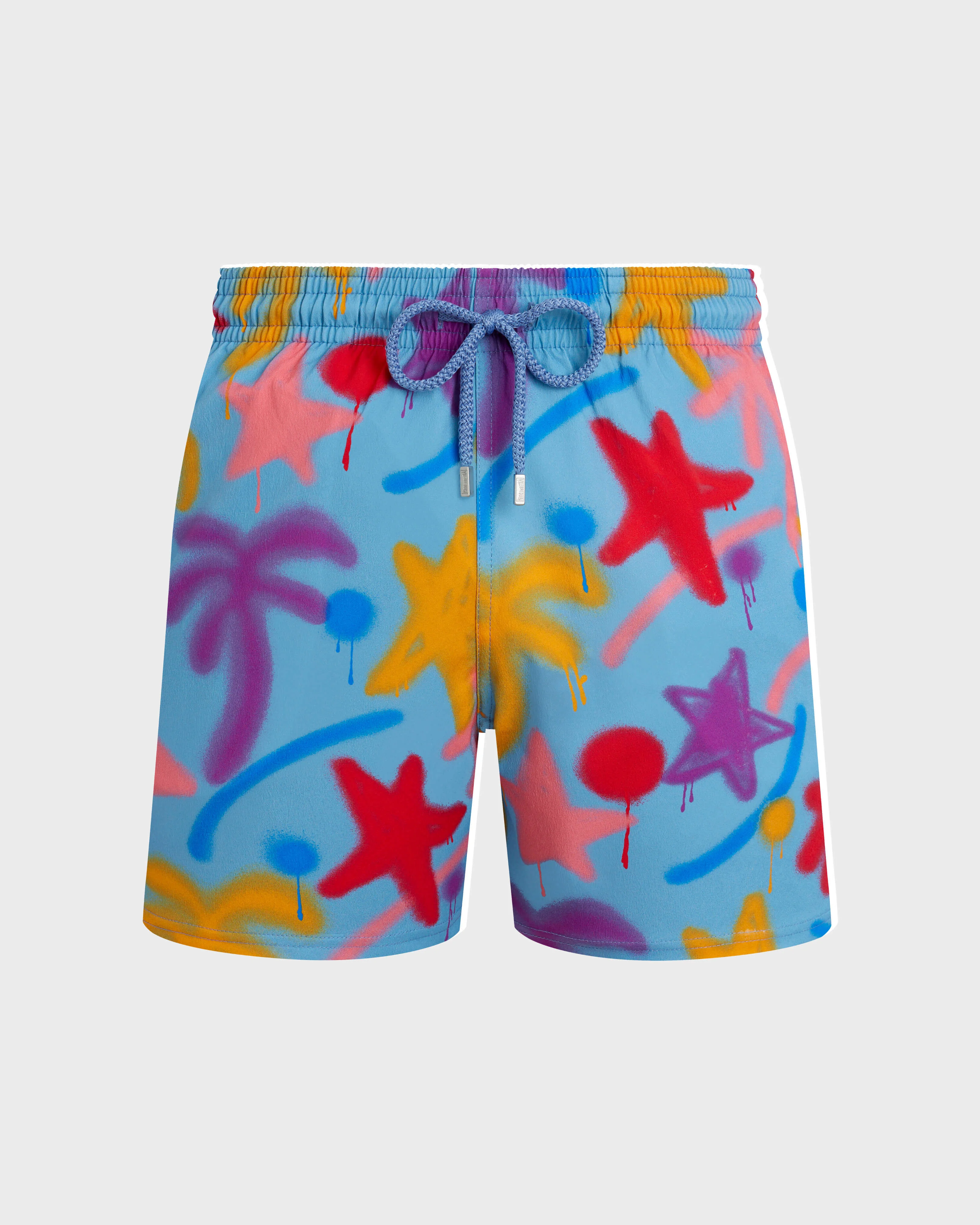 The Palm Angels x Vilebrequin Spring-Summer 2025 collection redefines the beachwear category, fusing vibrant prints with contemporary streetwear influences. The Spray Paint features a collage of spray-painted elements, evoking a street-art vibe with warm pink and cool blue tones. Signature branding is artfully woven throughout, transforming the logo into a true design statement - Shorter length swim trunks with stretch fabric - Elastic waistband with drawstring and zamac tips engraved Vilebrequin - Two side pockets and one rear couture pocket with velcro flap - Two back eyelets - Side leg length in size M: 36,8 cm - slightly shorter than the classic Moorea - The model is 189 cm and wears a M size - Men Swim shorts - Men Swim shorts Spray Print - 98% recycled polyamide 2% elastane Product Information Style: Moorise Model: MSOZF106-614 Color: BLUE SMOKE / BLUE