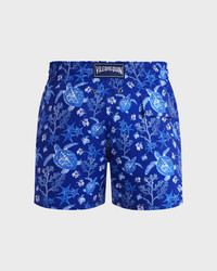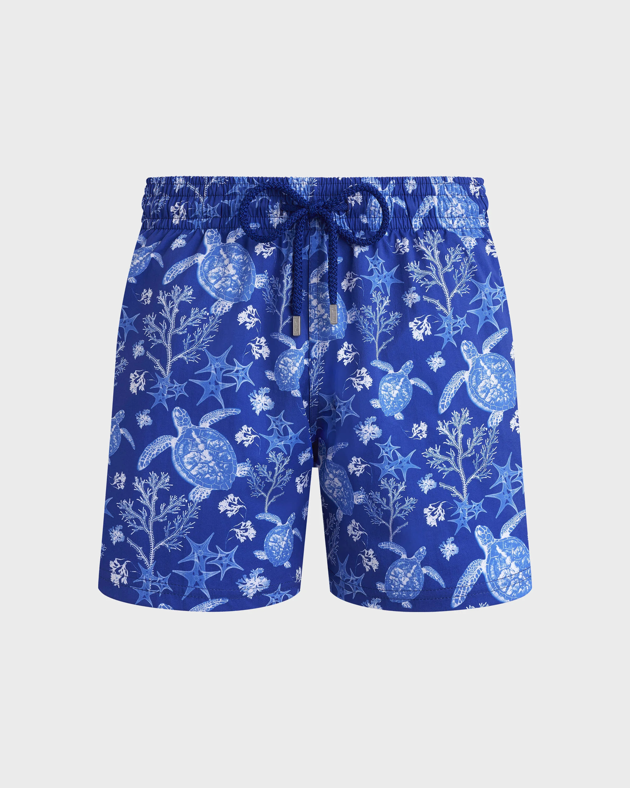 Celebrate summer in these stylish swim shorts crafted from recycled polyester and elastane. The elastic waist offers a comfortable fit while the drawstring features iconic Vilebrequin-engraved tips. - Shorter length swim trunks with stretch fabric - Elastic waistband with drawstring and zamac tips engraved Vilebrequin - Two side pockets and one rear couture pocket with velcro flap - Two back eyelets allow water to drain and reduce the "balloon” effect when emerging from the water - Side leg length in M: 36.8 cm - slightly shorter than a Moorea classic style - Men Swim shorts - Men Swim shorts X-Ray Turtles - 98% recycled polyamide 2% elastane Product Information Style: Moorise Model: MSOCF127-613 Color: MARRAKECH / BLUE