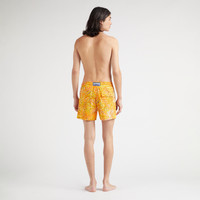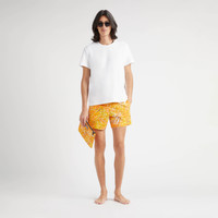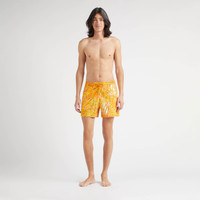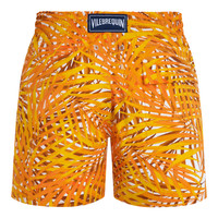 Cut in a flattering, short leg style, these Palm Leaf print swim trunks are an essential holiday accessory. Crafted from stretch recycled polyamide and elastane for the ultimate fit. - Shorter length swim trunks with stretch fabric - Elastic waistband with drawstring and zamak tips engraved Vilebrequin - Two side pockets and one rear couture pocket with velcro flap - Two back eyelets - Side leg length in size M: 14.5" - slightly shorter than the classic Moorea - Men Swim Trunks Palm Leaves - The model is 72" tall and wears a size M - Men Stretch Swim Trunks - 98% recycled polyamide 2% elastane Product Information Style: Moorise Model: MSOBF105-188 Color: MANGO / ORANGE