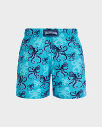 An ideal option for a luxury holiday, these octopus adorned men stretch swim trunks are a stylish choice. Crafted from recycled polyamide and elastane for the perfect fit. - Shorter length men swim trunks with stretch fabric - Elastic waistband with drawstring and zamak tips engraved Vilebrequin - Two side pockets and one rear couture pocket with velcro flap - Two back eyelets - Side leg length in size M: 14.5" - slightly shorter than the classic Moorea - The model is 72.8" tall and wears a size M - Men stretch Swim Trunks Poulpes - Men short Swim Trunks - 98% recycled polyamide 2% elastane Product Information Style: Moorise Model: MSOBF107-389 Color: BORA BORA / BLUE
