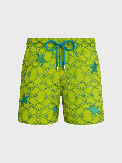 Product Detail 100% recycled polyamide A timeless pair of limited edition embroidered swim shorts in recycled polyamide with an elastic waistband and drawstring for a relaxed fit. Vilebrequin-engraved metal tips complete the detail. - Embroidered swimsuit, limited edition, 99 pieces for the colors Blue Note and Macaron Green, 199 pieces for the color Navy Blue - Swim trunks with elastic waistband with drawstring and silver tips (engraving 925 certified) - Side pockets and back pocket with Turtle personnalized round snap button. Two back eyelets - Enjoy a complimentary first repair of your swim trunks, if registered within 6 months - Fully lined with water-resistant mesh lining (100% polyamide) - Side leg length in size M: 15.6" - Inseam length in size M: 5,9" - The model is 6'1 and wears a M size - Men Swim Shorts - Men Swim Shorts Orcas Care To take care of your Swim Shorts we advise you to follow our suggestions below: - Wash at 30'C - Dry line in the shade - Do not bleach - Do not tumble dry - Iron at low temperature