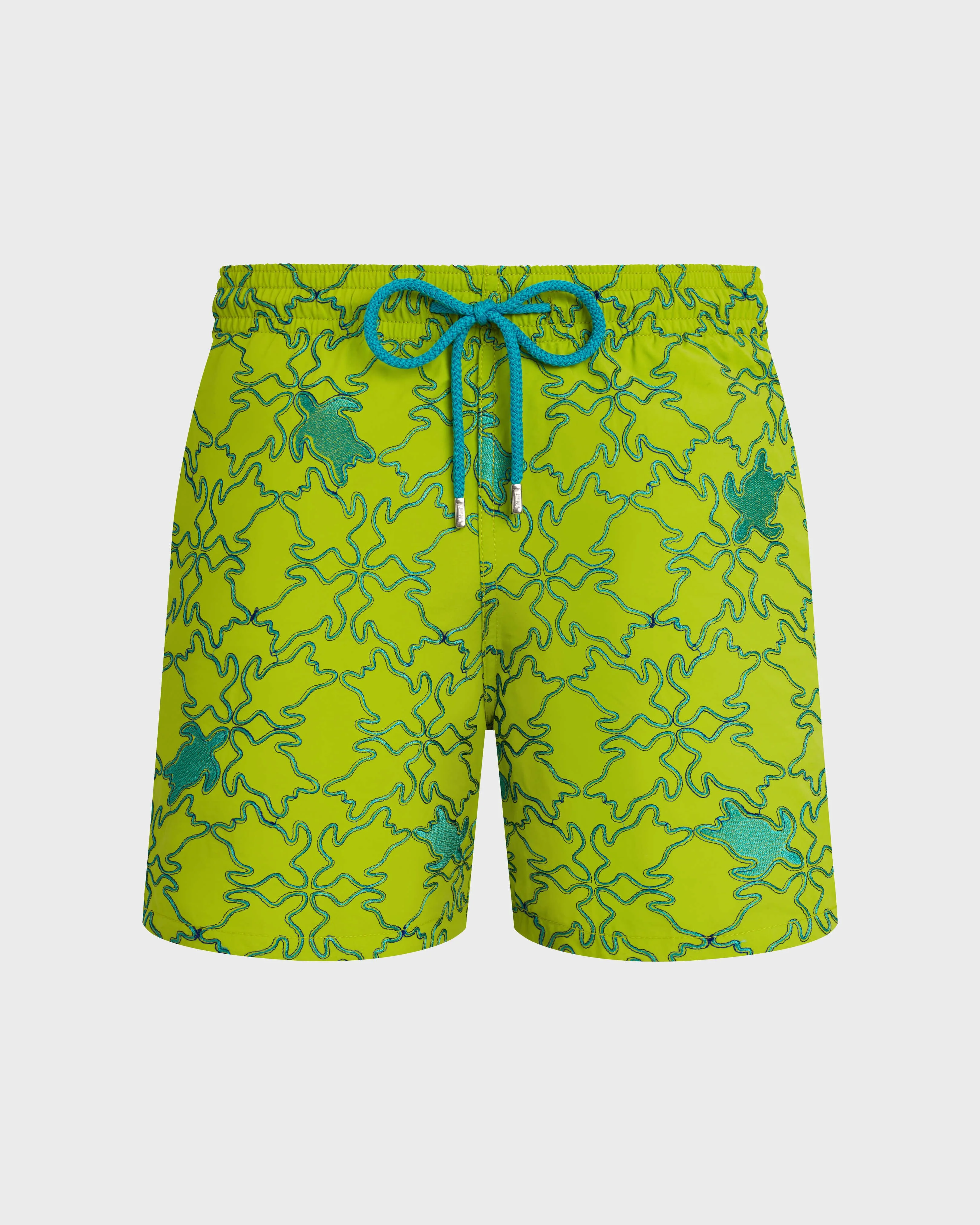 Product Detail 100% recycled polyamide Welcome summer in these Turtles Net-print swim shorts crafted from recycled polyamide. The iconic Vilebrequin logo enhances the back, while an elasticated waistband and drawstring with metal-engraved tips complete the detail. - Embroidered swimsuit, limited edition, 99 pieces for the colors Poppy Red and Lime Green, 199 pieces for the color Marrakech Blue. - Swim trunks with elastic waistband with drawstring and silver tips (engraving 925 certified) - Side pockets and back pocket with Turtle personnalized round snap button. Two back eyelets - Enjoy a complimentary first repair of your swim trunks, if registered within 6 months - Fully lined with water-resistant mesh lining (100% polyamide) - Side leg length in size M: 15.6" - Inseam length in size M: 5,9" - The model is 6'1 and wears a M size - Men Swim Shorts - Men Swim Shorts Turtles Net Care To take care of your Swim Shorts we advise you to follow our suggestions below: - Wash at 30'C - Dry line in the shade - Do not bleach - Do not tumble dry - Iron at low temperature