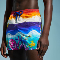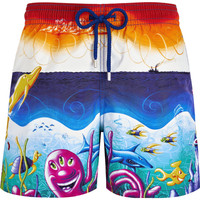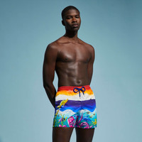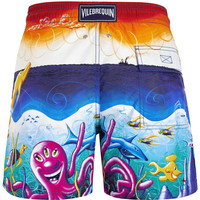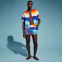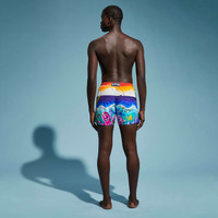 Kenny Scharf’s paintings build a childlike and happy universe, imbued by vibrant colors. Asking for an uninhibited look to his art, the artist applies here on textile his figures like he would on canvases or walls. Swimsuits, beachwear and accessories constitute Scharf’s generous collection for Vilebrequin. Comfortable men’s swim shorts - Elastic waistband with four lines of stitching and drawstring for optimal comfort - Peach finish for an extra soft feel and more suppleness - Quick-drying men’s swim shorts thanks to a special treatment - Flawless fit and comfort thanks to the resistant and soft inner briefs with no center seam (100% polyamide) - Mareviva Men’s swim shorts Swim shorts that suit every build - Men’s swim shorts length in size M: 39.4 cm - Swimwear with no ballooning thanks to two back eyelets - Vilebrequin engraved drawstring tips in Zamak, a stainless alloy (zinc, aluminium, magnesium) - Swimwear back pocket placed by hand for perfect print alignment - Model wears size M - Model measurements: Chest 98cm, Height 189cm, Waist 76cm, Hips 95cm Composition of the Moorea men’s swim shorts - 100% Recycled Polyamide