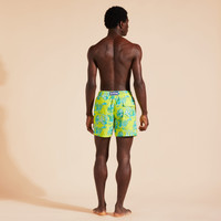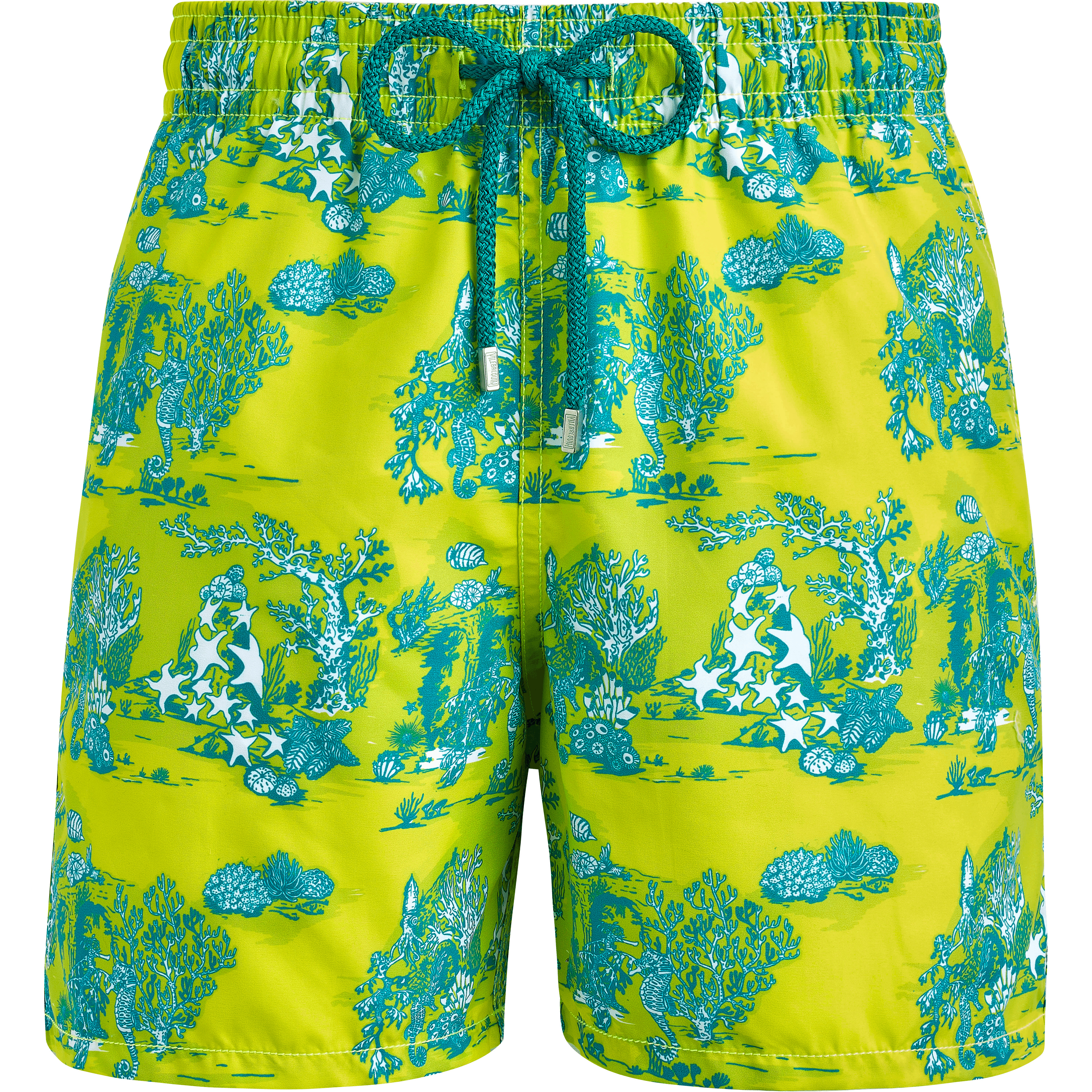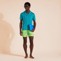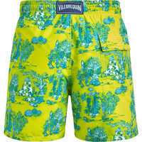 A vibrant print pair of recycled polyamide swim trunks designed to be eye-catching whether worn at the beach or to lunch. An elastic waistband and drawstring enhance the fit. - Elastic waistband swim trunks with drawstring and zamac tips engraved Vilebrequin - Side pockets - Hand-placement of back pocket for perfect visual alignment with swimwear print - Two back eyelets allow water to drain and avoid swim trunks from ballooning when emerging into water - Fully lined with water-resistant mesh lining (100% Polyamide) - Side leg length in size M: 15.6" - Men Swim Trunks - Men Swim Trunks Deep Sea Toile de Jouy - 100% Recycled Polyamide