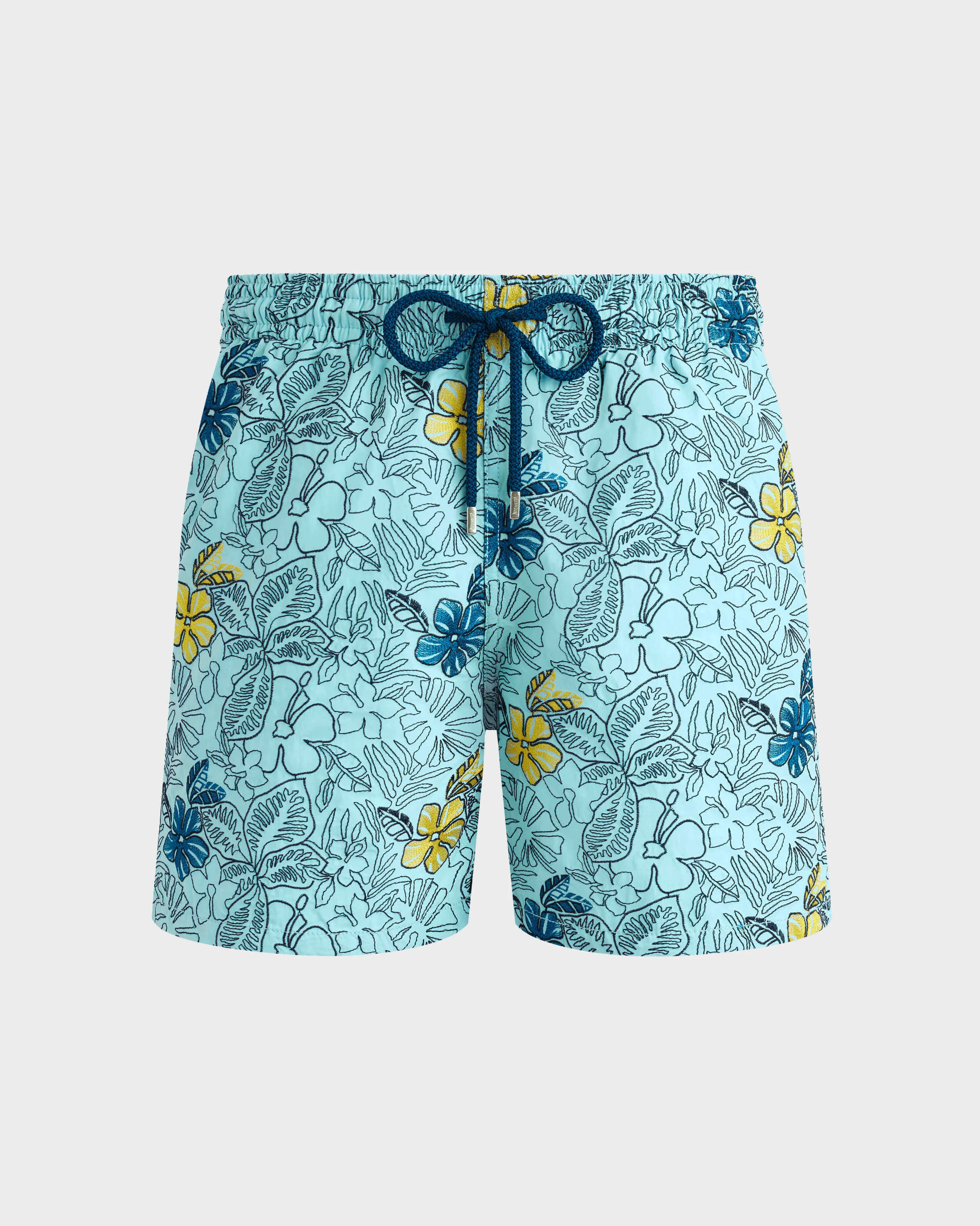 This pair of limited edition flower men swim trunks offers effortless beach style. Crafted from comfortable recycled polyamide, with an elastic and drawstring waistband, these are perfect for long, sunny days. - Embroidered swim trunks for men, limited edition - Men Swim trunks with elastic waistband with drawstring and silver tips (engraving 925 certified) - Side pockets and back pocket with Turtle personnalized round snap button - Two back eyelets - Fully lined with water-resistant mesh lining (100% polyamide) - Side leg length in size M: 15.6" - The model is 70.8" tall and wears a size M - Men Swim Trunks Flowers - Limited Edition - Men Swim Trunks - 100% recycled polyamide Product Information Style: Mistral Model: MISBC410-344 Color: BLUE NOTE / BLUE