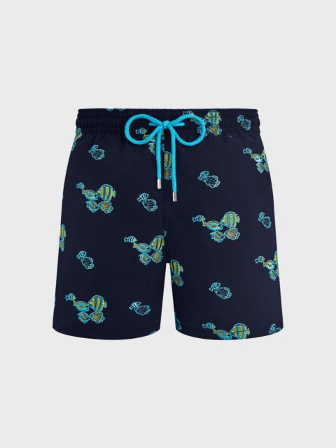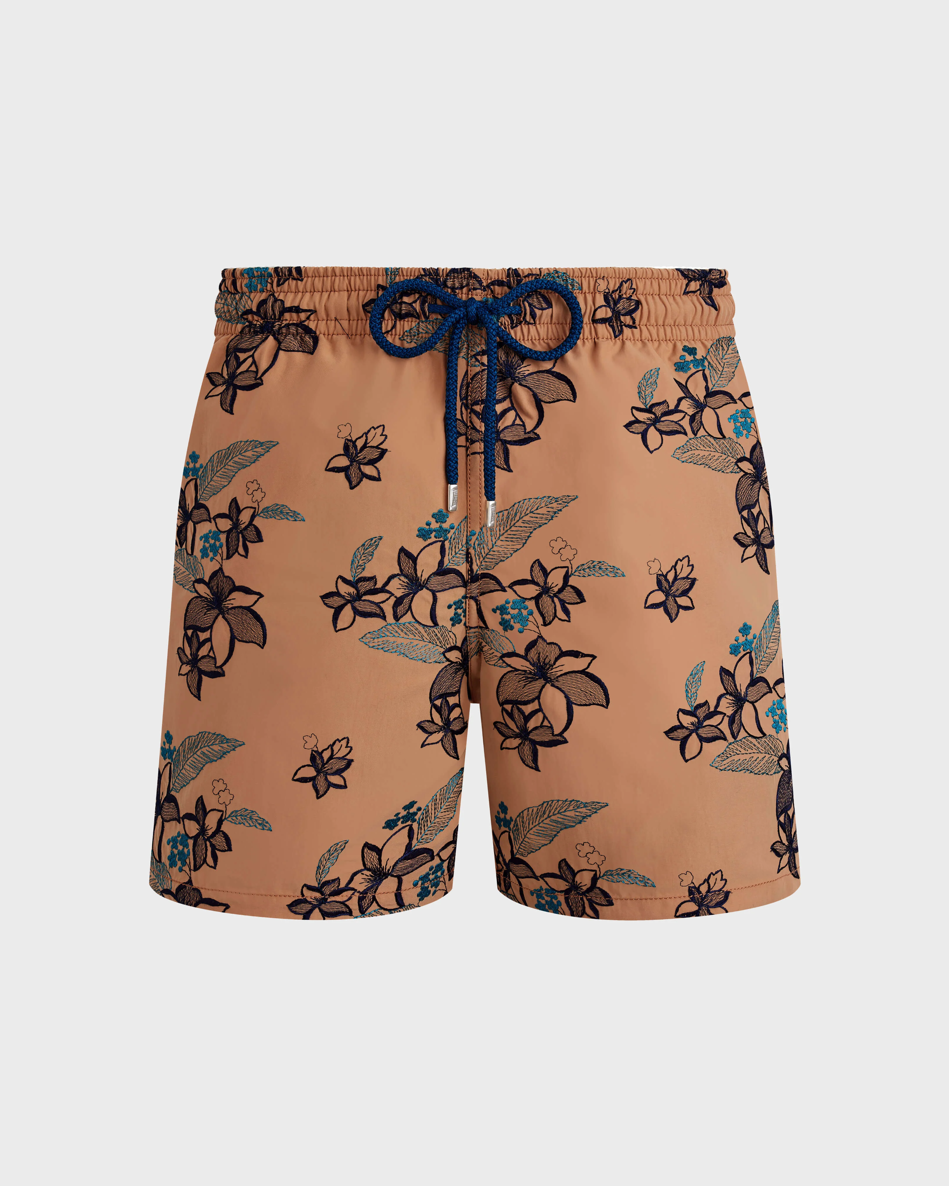 These embroidered tropical flower swim shorts feature an elasticated waist and drawstring for comfort. Side and a back pocket enhanced with a turtle-embossed snap button add a stylish finish. - Embroidered men swim trunks, limited numbered edition, 99 pieces for the color moka, 99 pieces for the color midnight, 99 pieces for the color peacock - Swim trunks with elastic waistband with drawstring and silver tips (engraving 925 certified) - Side pockets and back pocket with Turtle personnalized round snap button. Two back eyelets - Enjoy a complimentary first repair of your swim trunks, if registered within 6 months - Fully lined with water-resistant mesh lining (100% polyamide) - Side leg length in size M: 15.6" - Inseam length in size M: 5,9" - The model is 6'0.83" and wears a M size - Men Swim trunks - Men Swim trunks shorts Embroidered Flowers Power - 100% recycled polyamide Product Information Style: Mistral Model: MISCC618-520 Color: MOCHA / BROWN
