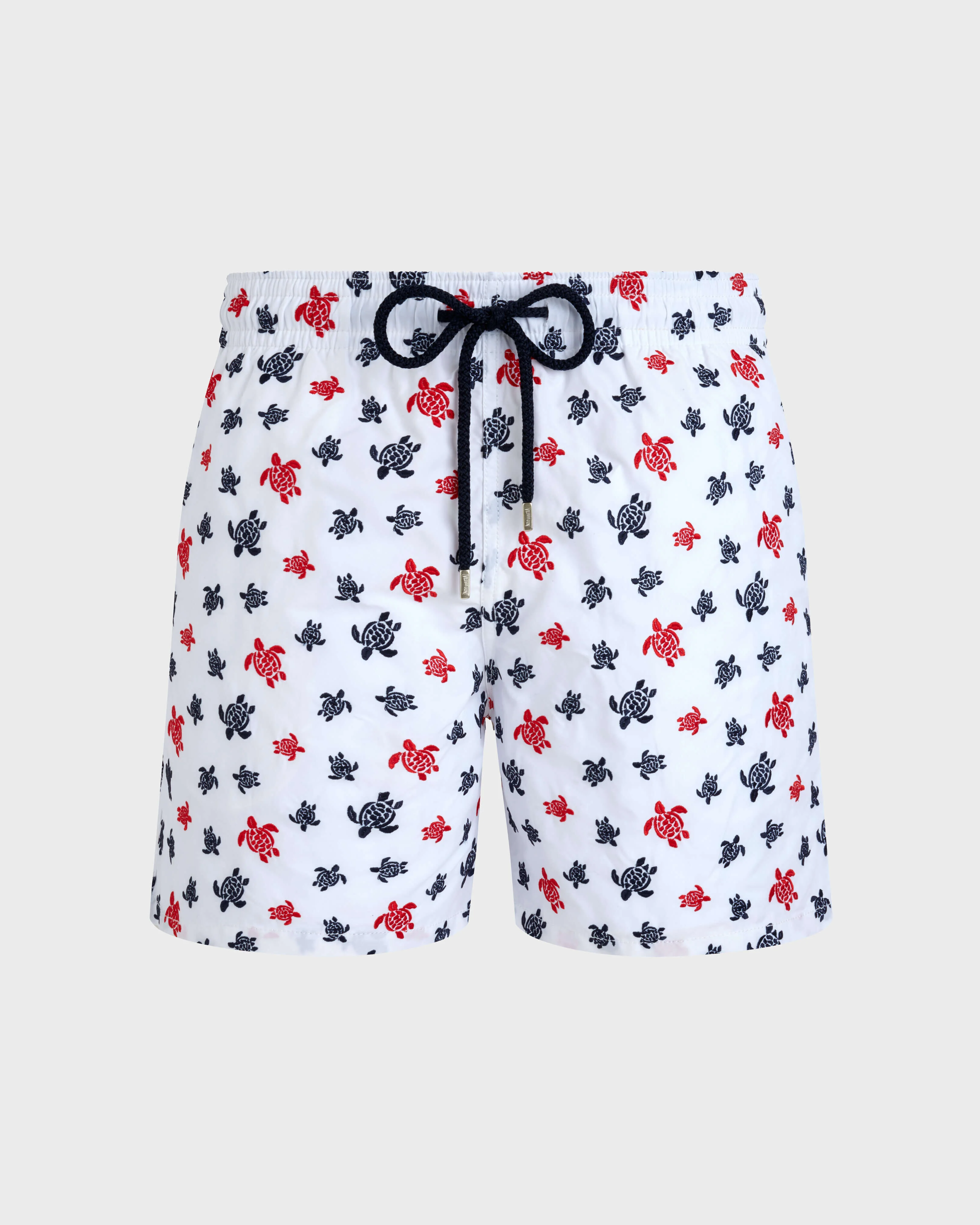 A stylish pair of holiday men swim trunks embroidered with the iconic Vilebrequin turtle. Combine with a shirt for a sophisticated look when sipping cocktails or lunching by the ocean. - Embroidered swim shorts for men, limited edition, 199 copies - Men Swim trunks with elastic waistband with drawstring and silver tips (engraving 925 certified) - Side pockets and back pocket with Turtle personnalized round snap button. Two back eyelets - Enjoy a complimentary first repair of your men swim trunks, if registered within 6 months - Fully lined with water-resistant mesh lining (100% polyamide) - Side leg length in size M: 15.6" - The model is 74.4" tall and wears a size M - Men Swim Trunks Micro Ronde des tortues brodees - Limited Edition - Men Swim Trunks - 100% recycled polyamide Product Information Style: Mistral Model: MISBC439-010 Color: WHITE / WHITE
