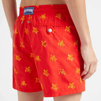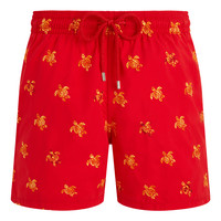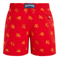 These brightly coloured men swim trunks adorned with turtles capture the exotic holiday theme. Cut from recycled polyamide with an elasticated waist and drawstring for added comfort. - Embroidered men swim trunks limited edition - Swim trunks with elastic waistband with drawstring and silver tips (engraving 925 certified) - Side pockets and back pocket with Turtle personnalized round snap button - Two back eyelets - Fully lined with water-resistant mesh lining (100% polyamide) - Enjoy a complimentary first repair of your swim trunks, if registered within 6 months - Side leg length in size M: 15.6" - The model is 74.4" tall and wears a size L - Men Swim Trunks Micro Ronde des Tortues Diagonale - Men Swim Trunks - 100% recycled polyamide