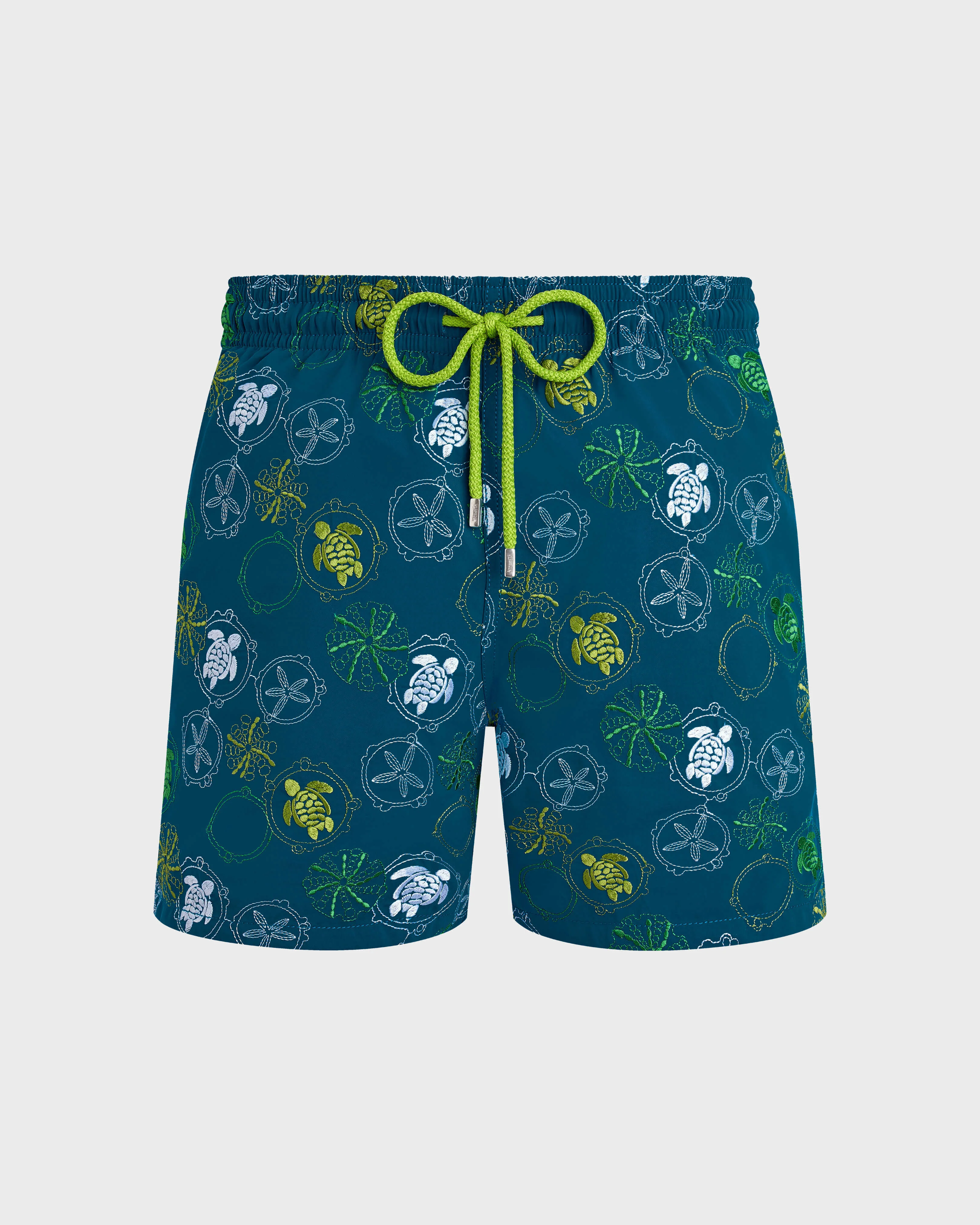 A timeless pair of embroidered swim shorts in recycled polyamide with an elastic waistband and drawstring for a relaxed fit. Vilebrequin-engraved metal tips complete the detail. - Embroidered men swim trunks , limited edition: 199 pieces for the color mango, 199 pieces for the color lipstick, 199 pieces for the color peacock - Swim trunks with elastic waistband with drawstring and silver tips (engraving 925 certified) - Side pockets and back pocket with Turtle personnalized round snap button. Two back eyelets - Enjoy a complimentary first repair of your swim trunks, if registered within 6 months - Fully lined with water-resistant mesh lining (100% polyamide) - Side leg length in size M: 15.6" - Inseam length in size M: 5,9" - The model is 6'0.44" and wears a M size - Men Swim Trunks shorts - Men Swim Trunks Embroidered Oursins - 100% recycled polyamide Product Information Style: Mistral Model: MISCC515-611 Color: PEACOCK / BLUE