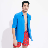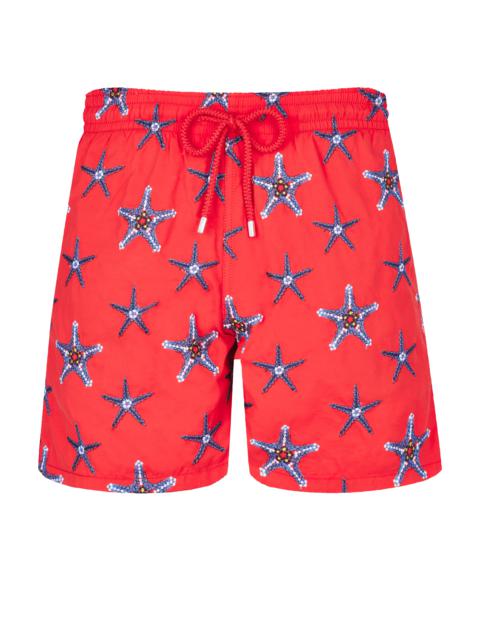 The stars are sparkling in the water with these Mistral Starfish Dance limited edition men’s embroidered swimming trunks. With their beautiful line sketch, these premium men swim trunks have three pockets, including one with a custom press stud on the back. They have silver tips. - Embroidered fabric, numbered limited edition to 205 copies - Men swim trunks with elastic waistband with drawstring and silver tips (engraving 925 certified) - Side pockets and back pocket with Turtle personnalized round snap button - Men swim trunks with two back eyelets - Side leg length in size M: 15.6" - Men swim trunks - Men swim trunks Starfish Dance - Model wears size M - Model measurements: Bust 38.6”, Height 72.4”, Waist 30.7”, Hips 36.2” - 100% Recycled polyamide