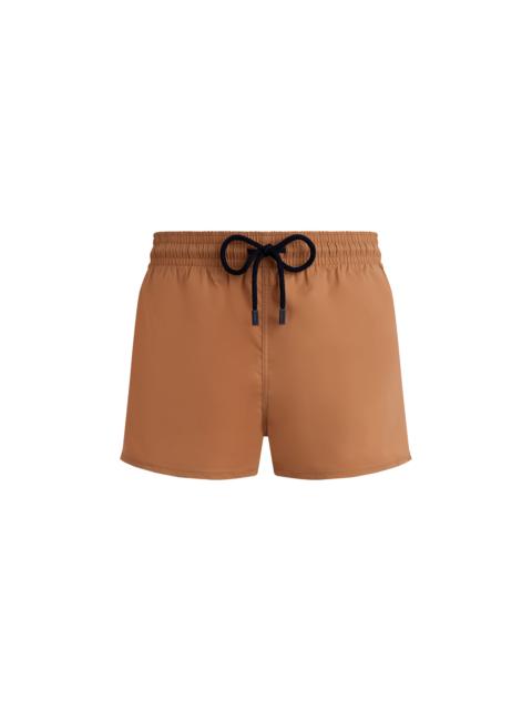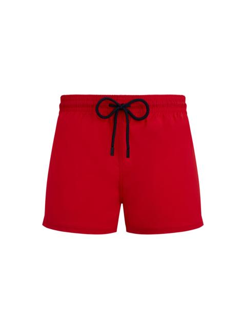 - Short length swim trunks for men with elastic waistband. Navy drawstring and navy Zamak tips engraved with Vilebrequin - Two side slits - Swim trunks for men without side and back pockets - Two back eyelets - Side leg length in size M: 12.2" - Inseam for size M: 2.25" - Men Swim Trunks - Men Swim Trunks Solid - 98% Recycled Polyester - 2% Elastane