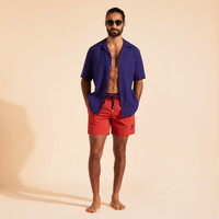 Elegance goes minimalist with these plain two-tone Moka swimming trunks. Look for the most serene of sea creatures undulating peacefully as part of a timeless contrast. - Bicolor swim trunks for men with contrasting color inside waistband and .5" of outer waistband - Elastic waistband with drawstring and Zamac tips engraved with Vilebrequin - Two side pockets and one rear pocket with velcro flap - Men's swim trunks with two back eyelets allow water to drain and reduce the “balloon” effect when emerging from the water - Embroidered Turtle on bottom of left leg - Side leg length in size M: 15.6" - Men Swim Trunks - Men Swim Trunks Solid Bicolore - Model wears size M - Model measurements: Bust 37.4”, Height 72.4”, Waist 29.5”, Hips 37” - 100% Recycled Polyamide