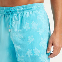 These water-reactive swim shorts feature two designs in one -the turtles appear upon entering the water. Crafted from recycled polyamide with a comfortable elastic waist for the optimum relaxed look. - Elastic waistband swim trunks with drawstring and zamak tips engraved Vilebrequin - Side pockets - Hand-placement of back pocket - Two back eyelets allow water to drain and avoid swim trunks from ballooning when emerging into water - Fully lined with water-resistant mesh lining (100% polyamide) - Side leg length in size M: 15.6" - The water-reactive effect has the particularity of fading with use over time. We recommend ironing your garment inside out with a low heat setting after each wash to preserve this effect, following the care instructions provided - Men Water-reactive Swim Trunks Rondes des Tortues - The model is 70.8" tall and wears a size M - Men Swim Trunks - 100% recycled polyamide
