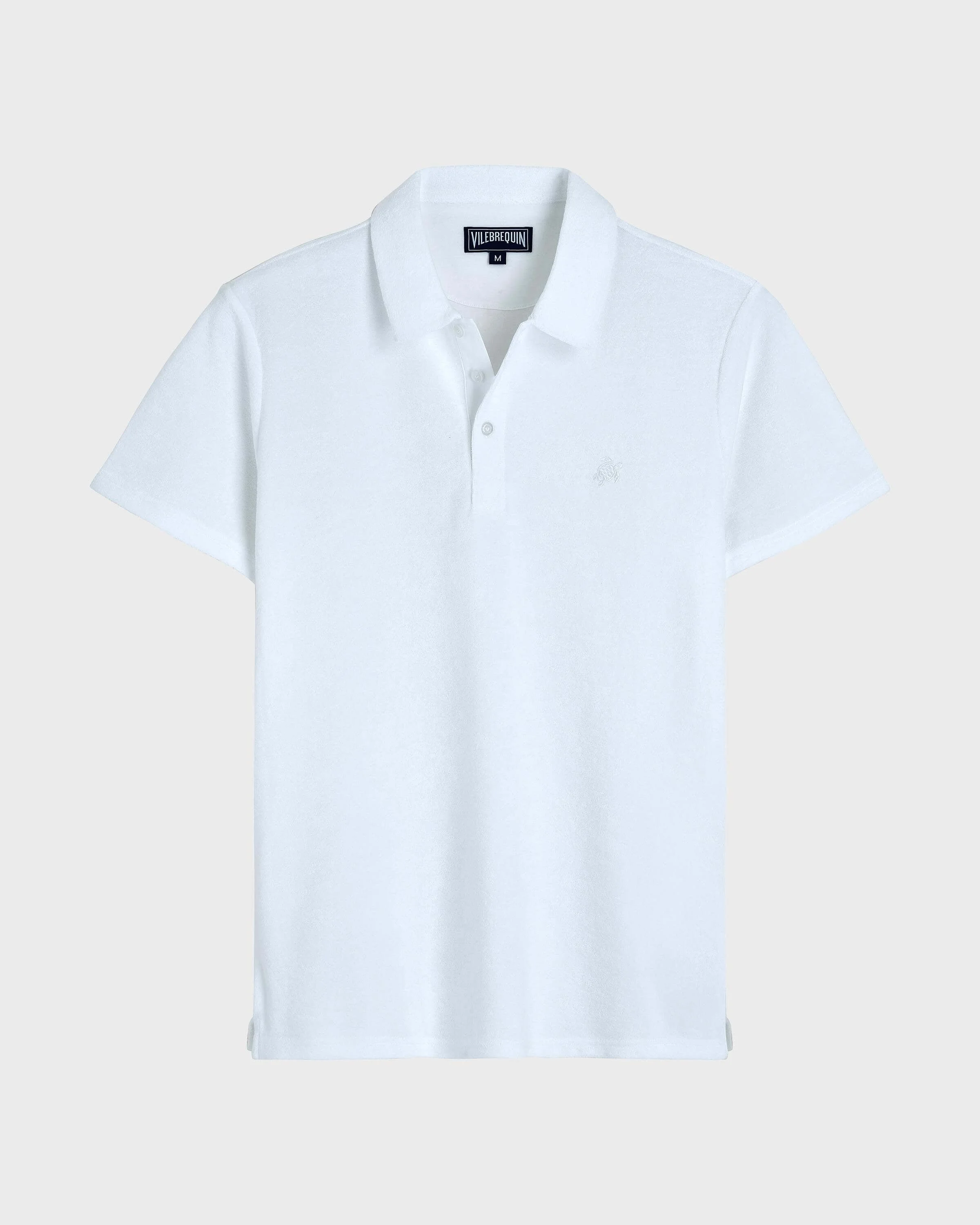 An ultra-comfortable organic cotton and polyamide polo shirt enhanced with 3 buttons and the iconic turtle embroidered on the chest. Look for the turtle on the new Phoenix men's plain terry cloth polo shirt. Soft, comfortable and trendy, this short-sleeved basic has a buttoned placket and an embroidered turtle on the front. It is suitable for all occasions, at the beach or around town. - Men Terry Polo Shirt - 3 buttons on front placket - Men polo with embroidered tone on tone on the chest - Middle back Length for a size M: 68.00cm - Middle back Length for a size M: 26.77" - Men Polo - Men Polo Solid - Model wears size M - Model measurements: Bust 38.2”, Height 72.5”, Waist 31.9”, Hips 35.8” - 86% Cotton organic - 14% Polyamide Product Information Style: Phoenix Model: PHEC3Q00-010 Color: WHITE / WHITE