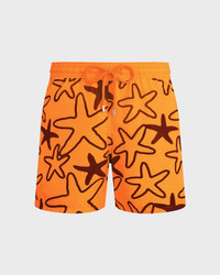 Make an entrance on the beach in these vibrant, lightweight, flocked shorts crafted from recycled polyester and featuring Vilebrequin-engraved drawstring tips. It packs into the back pocket for easy traveling. - Ultra-light material - Elastic waistband with drawstring and Zamac tips engraved Vilebrequin - Two side pockets - Two back eyelets - Travel-friendly swimsuit folds completely into the back pocket - Side leg length in M: 39.5 cm - Men Swim shorts - Men Swim shorts Flocked Starlettes - 100% recycled polyester Product Information Style: Mahina Model: MAHCD302-136 Color: FLUO FIRE / ORANGE