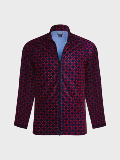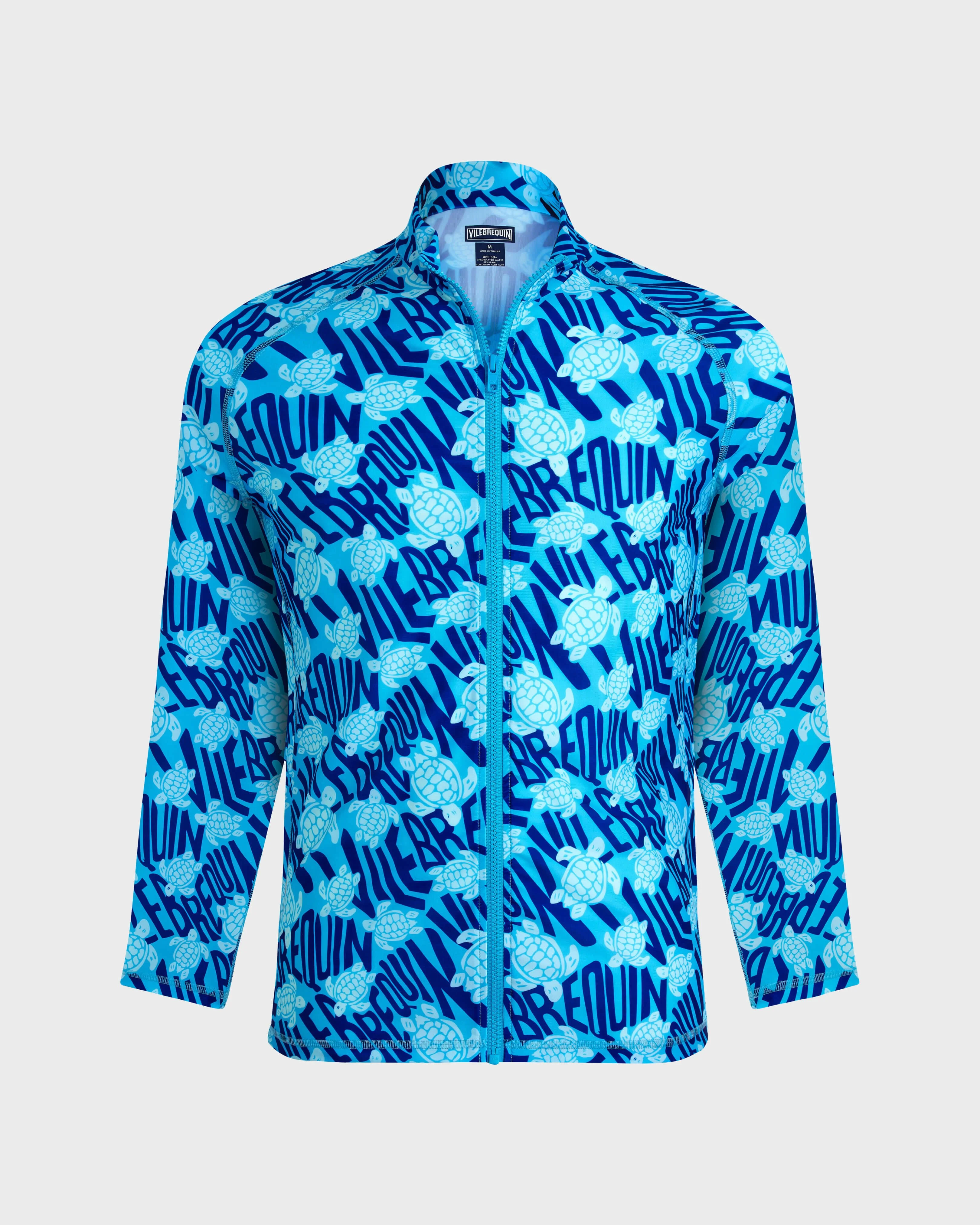 This rashguard, featuring the iconic Ronde des Tortues and Vilebrequin print, provides full UV protection and features a high neck, long sleeves for coverage, and a convenient front zip. - High-neck anti-UV T-shirt for men - Slim fit - Long raglan sleeves - Front zip - Middle back length M size: 27.5" - Sun cream and oil resistant - The model is 6'0.83" and wears a M size - Men Rashguard - Men Rashguard Ronde des tortues logo - 78% recycled polyamide 22% elastane Product Information Style: Rocker-z Model: ROZCR312-612 Color: BLUE TOPAZ / BLUE