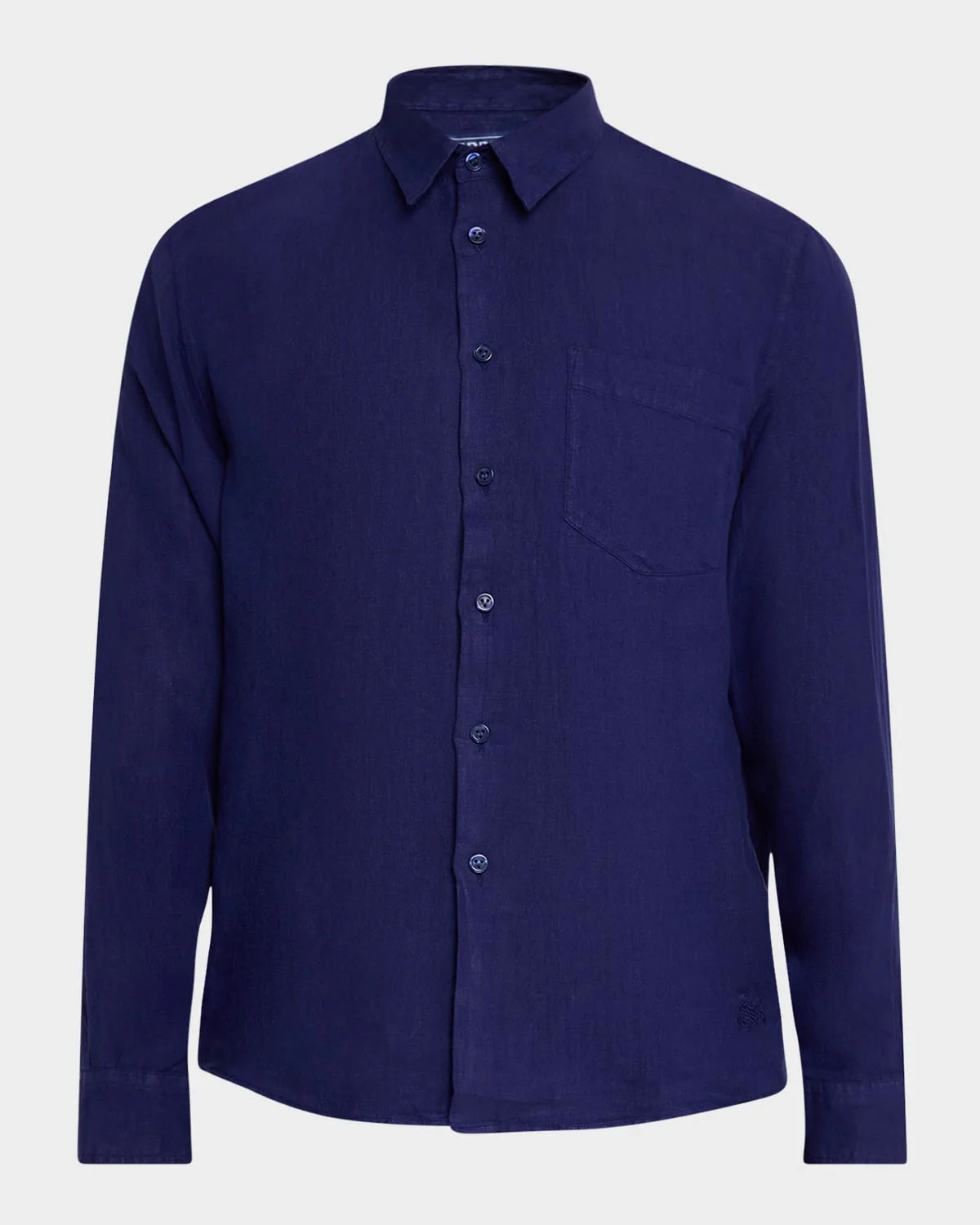 Vilebrequin "Caroubis" sport shirt in soft linen. Spread collar; button front. Chest patch pocket. Barrel cuffs. Regular fit. Side pleats at back yoke. Tonal turtle embroidery at hem. Imported.
