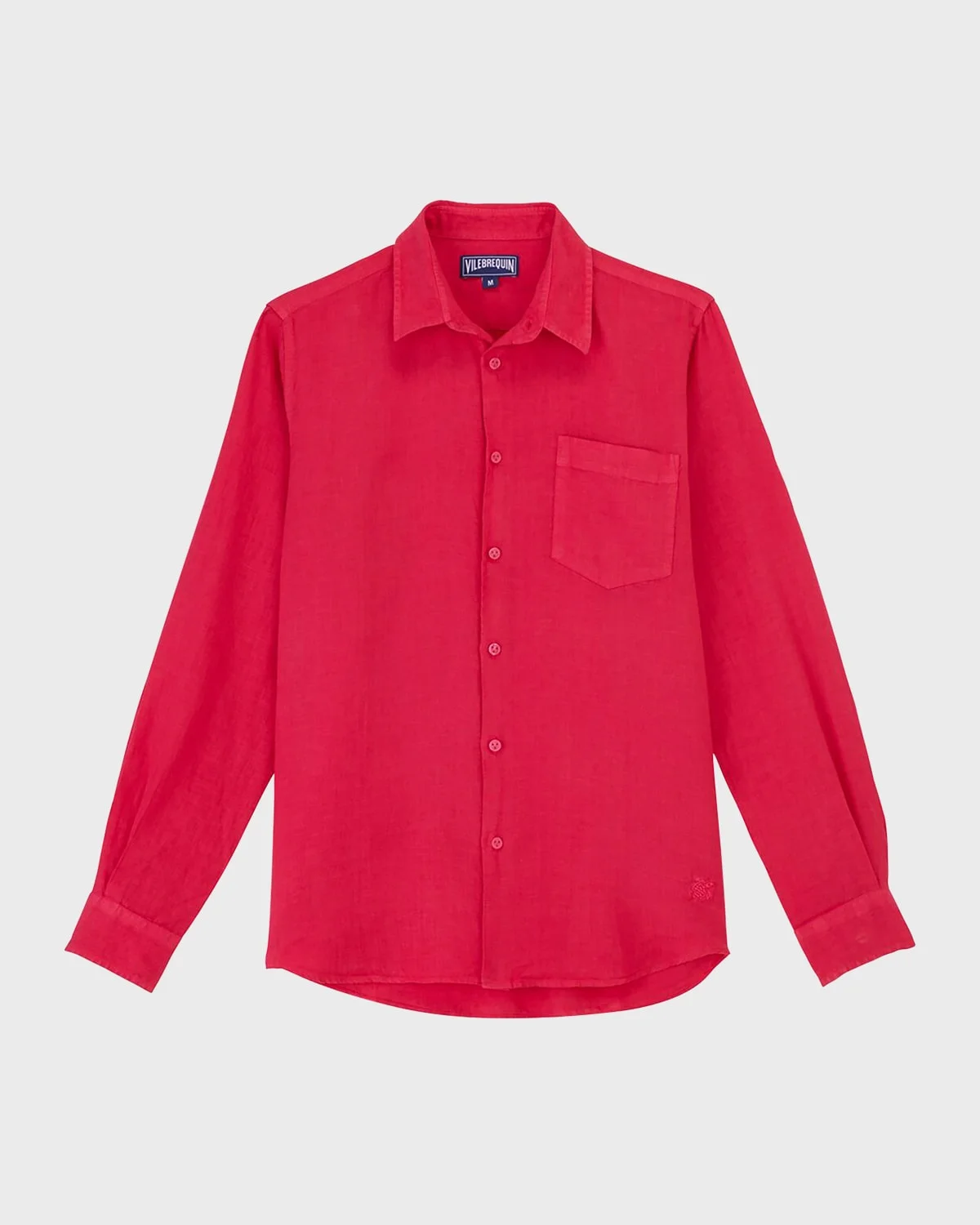 Vilebrequin "Caroubis" sport shirt in soft linen. Spread collar; button front. Chest patch pocket. Barrel cuffs. Regular fit. Side pleats at back yoke. Tonal turtle embroidery at hem. Imported.