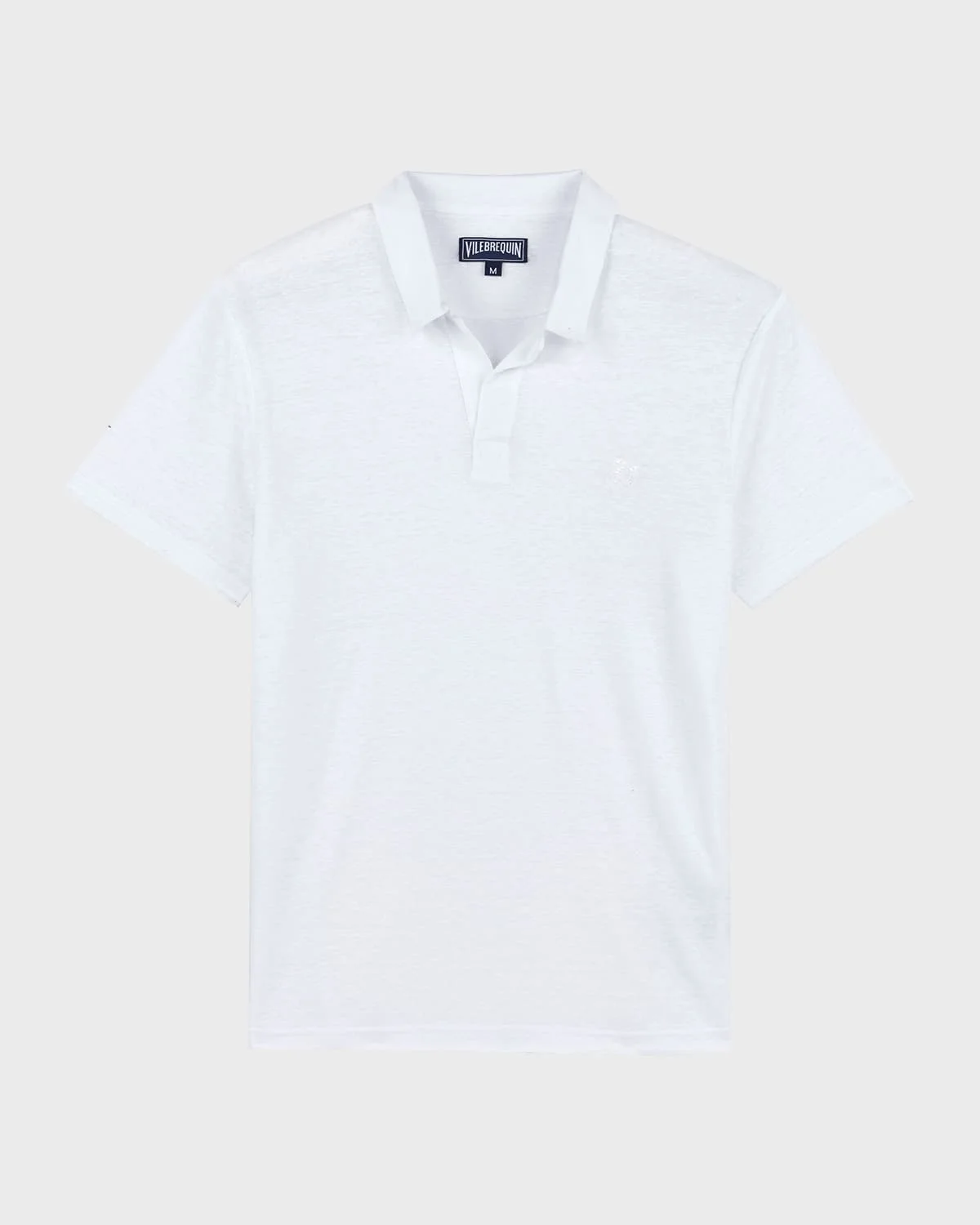 Vilebrequin "Pyramid" polo in linen. Spread collar; V front. Embroidered logo detail. Straight hem. Imported.
