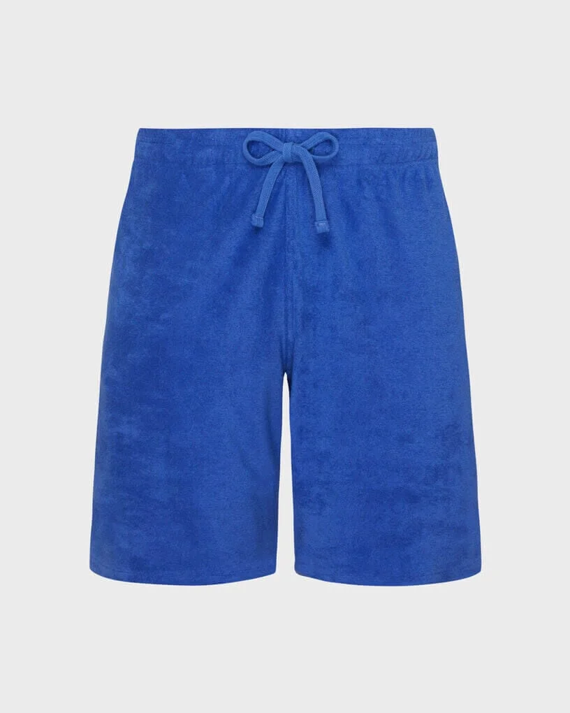 Comfort is genderless with these Vilebrequin terry bermuda shorts. This comfortable basic is as essential for lazing around at home as it is for a stroll at the beach. The bermuda shorts have an elasticated waistband with a drawstring, as well as a Vilebrequin logo and a patch pocket with a flap on the back. - Bermuda short in lightly terry - Two italian side pockets - Back flap pocket with velcro closure and center back - Elastic waistband, tone on tone drawstring with custom Vilebrequin zamac metal tips - Bottom leg widtth for a size M: 10.63" - Side length for a size M: 19.29" - Front crotch Length for a size M: 12.00" - Solid Men Bermuda - Men Bermuda - Model wears size M - Model measurements: Height 75.2”, Bust 39.4”, Waist 32.3”, Hips 39.8” - 86% Organic Cotton - 14% Polyamide Product Information Style: Bolide Model: BOLC3Q02-613 Color: MARRAKECH / BLUE
