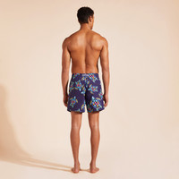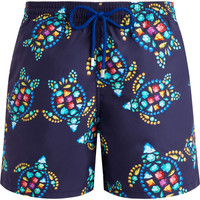 These brightly printed swim shorts add a touch of fun to summer. Made from comfortable, eco-friendly recycled polyamide and featuring an elastic waist and drawstring for easy adjustment. - Elastic waistband swim trunks with drawstring and zamac tips engraved Vilebrequin - Side pockets - Hand-placement of back pocket for perfect visual alignment with swimwear print - Two back eyelets allow water to drain and avoid swim trunks from ballooning when emerging into water - Fully lined with water-resistant mesh lining (100% Polyamide) - Side leg length in size M: 15.6" - Men Swim Trunks - Men Swim Trunks Vendome Turtles - 100% Recycled Polyamide Product Information Style: Moorea Model: WB-MOOAB122-HOM-605 Color: MIDNIGHT / BLUE