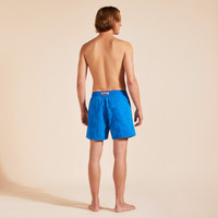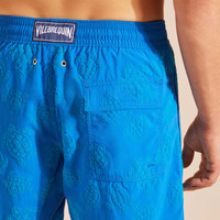 Velvet-touch, this pair of men’s swim trunks in recycled polyamide come with an elastic waistband and drawstring for extra comfort. - Elastic waistband swim trunks with drawstring and zamac tips engraved Vilebrequin - Side pockets - Hand-placement of back pocket for perfect visual alignment with swimwear print - Two back eyelets allow water to drain and avoid swim trunks from ballooning when emerging into water - Fully lined with water-resistant mesh lining (100% Polyamide) - Side leg length in size M: 15.6" - Men Swim Trunks - Men Swim Trunks Vendome Turtles - 100% Recycled Polyamide Product Information Style: Moorea Model: MOOAD222-602 Color: PALACE / BLUE