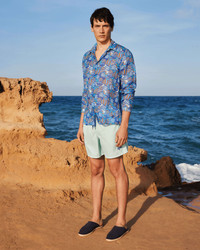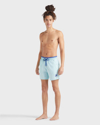 Elegance goes minimalist with these plain two-tone Moka swimming trunks. Look for the most serene of sea creatures undulating peacefully as part of a timeless contrast. Elegance goes minimalist with these plain two-tone Moka swimming trunks. Look for the most serene of sea creatures undulating peacefully as part of a timeless contrast. - Bicolor swim trunks for men with contrasting color inside waistband and .5" of outer waistband - Elastic waistband with drawstring and Zamac tips engraved with Vilebrequin - Two side pockets and one rear pocket with velcro flap - Men's swim trunks with two back eyelets allow water to drain and reduce the “balloon” effect when emerging from the water - Embroidered Turtle on bottom of left leg - Side leg length in size M: 15.6" - Men Swim Trunks - Men Swim Trunks Solid Bicolore - Model wears size M - Model measurements: Bust 37.4”, Height 72.4”, Waist 29.5”, Hips 37” - 100% Recycled Polyamide Product Information Style: Moka Model: MOKU3A01-344 Color: BLUE NOTE / BLUE
