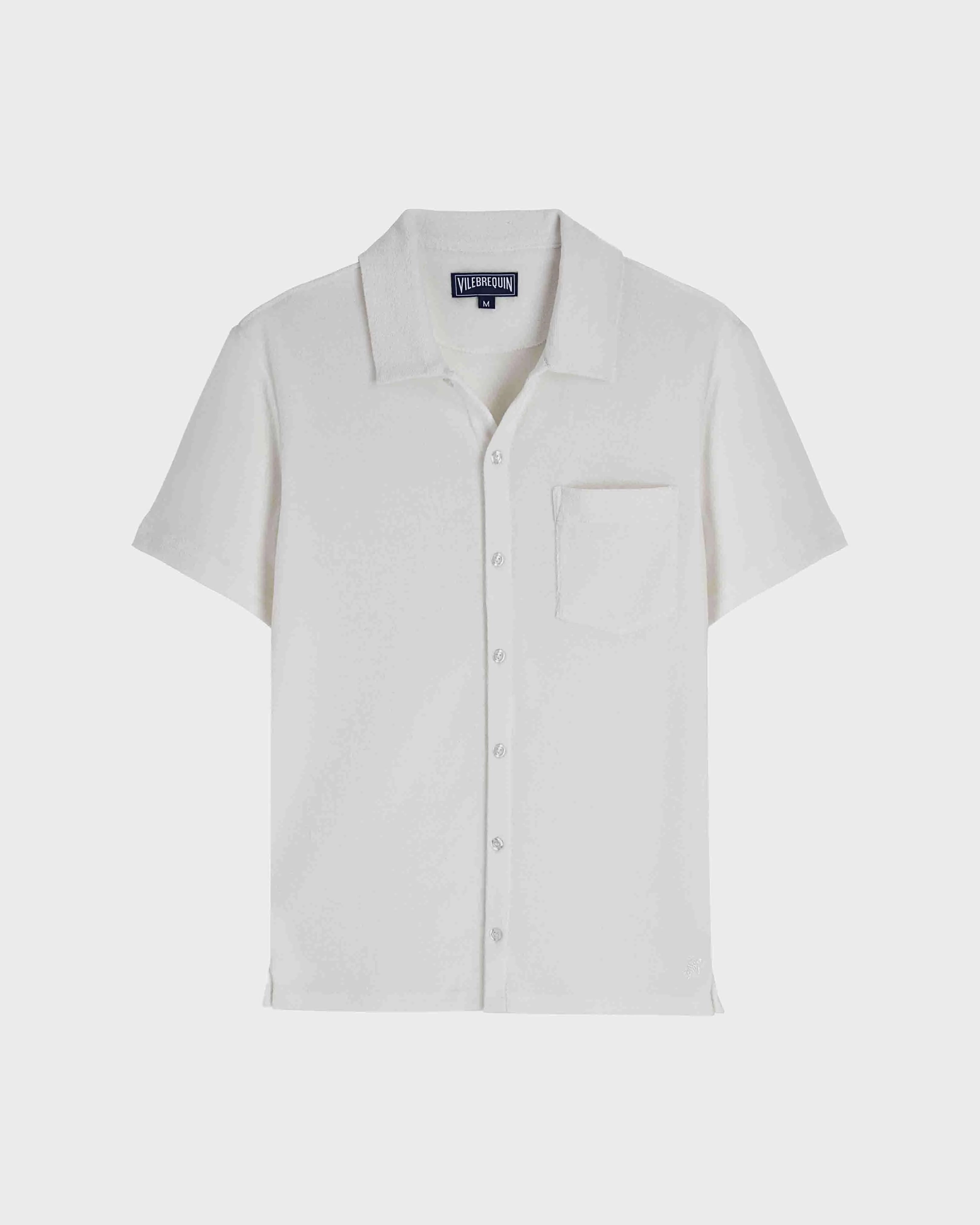 - Bowling shirt for men - Short sleeves with turned back cuffs - Chest pocket - Two slots on each side - Embroidered turtle tone on tone on the bottom left - Button fastening - Middle back length for a size M: 29.13" - Men Shirt - Men Shirt Solid - Model wears size M - Man model measurements: Bust 38.2”, Height 72.5”, Waist 31.9”, Hips 35.8” - Woman model measurements: Chest 33”, Height 67”, Waist 23.2”, Hips 33.5” - 86% Cotton organic - 14% Polyamide