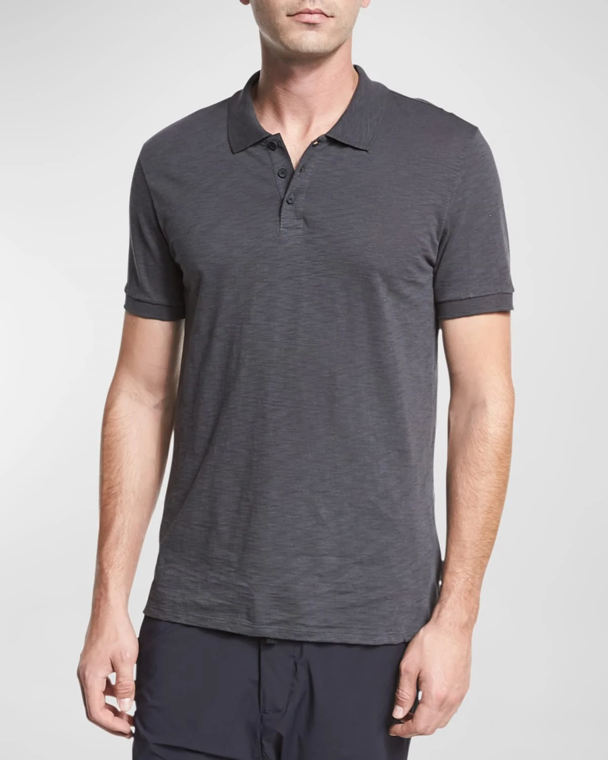 Vince classic polo shirt in slub knit. Approx. length: 28" Spread collar; threebutton placket. Short sleeves; ribbed cuffs. Slim fit. Pullover style. Cotton. Machine wash cold Imported. Size Note: Model height: 6'2/ inseam 34"/ waist 30" Model is wearing size medium