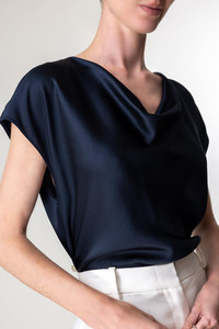 DETAILS AND INSIGHT Vince cowl neck cap sleeve blouse in navy. 100% silk Hand wash cold Made in China Style V796112595-403CBL