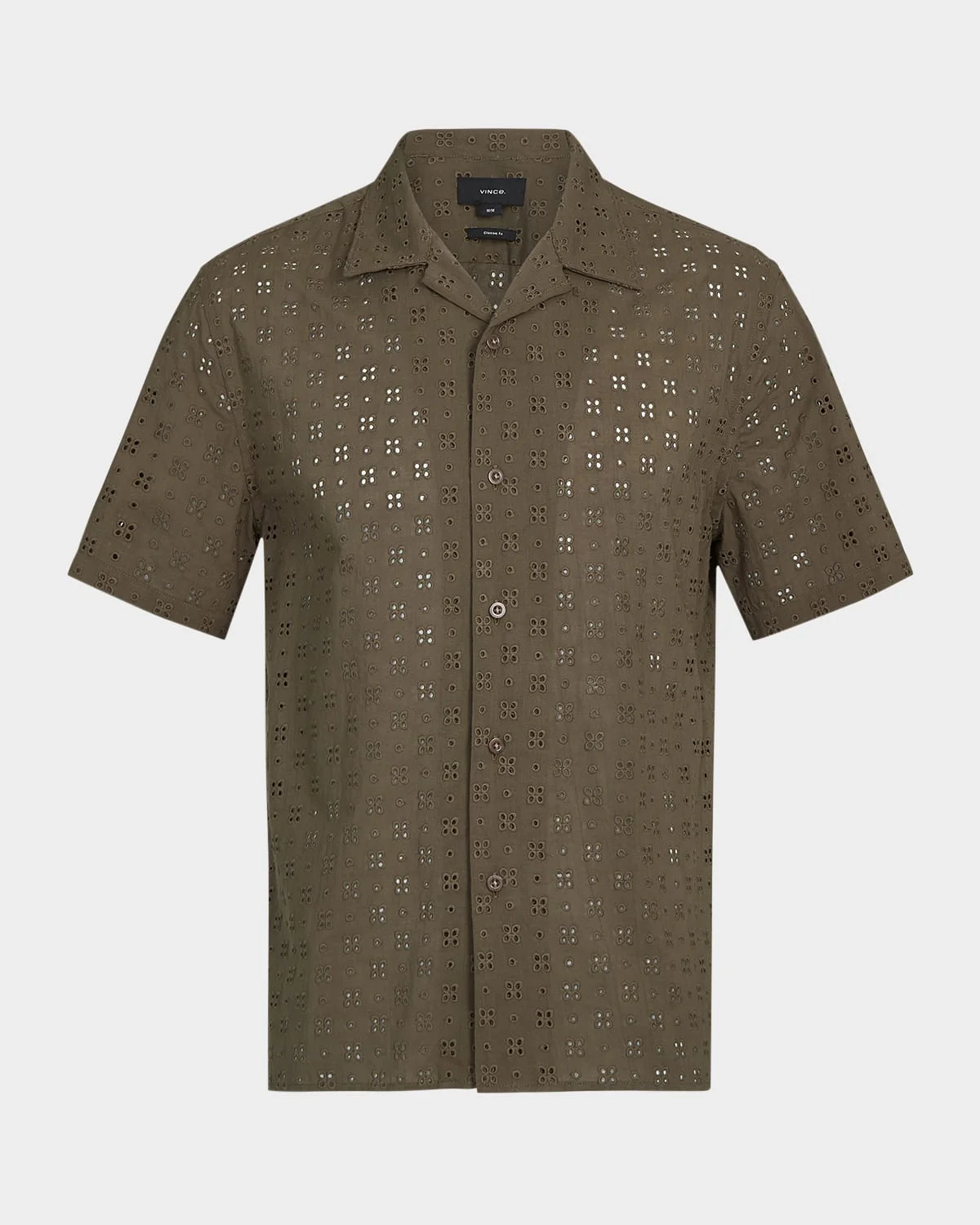 - Vince camp shirt defined by unique cotton eyelet fabric with allover clover motifs - Notch collar - Button placket - Short sleeves - Back yoke - Straight hem - Classic fit - Cotton - Machine wash cold, line dry - Imported