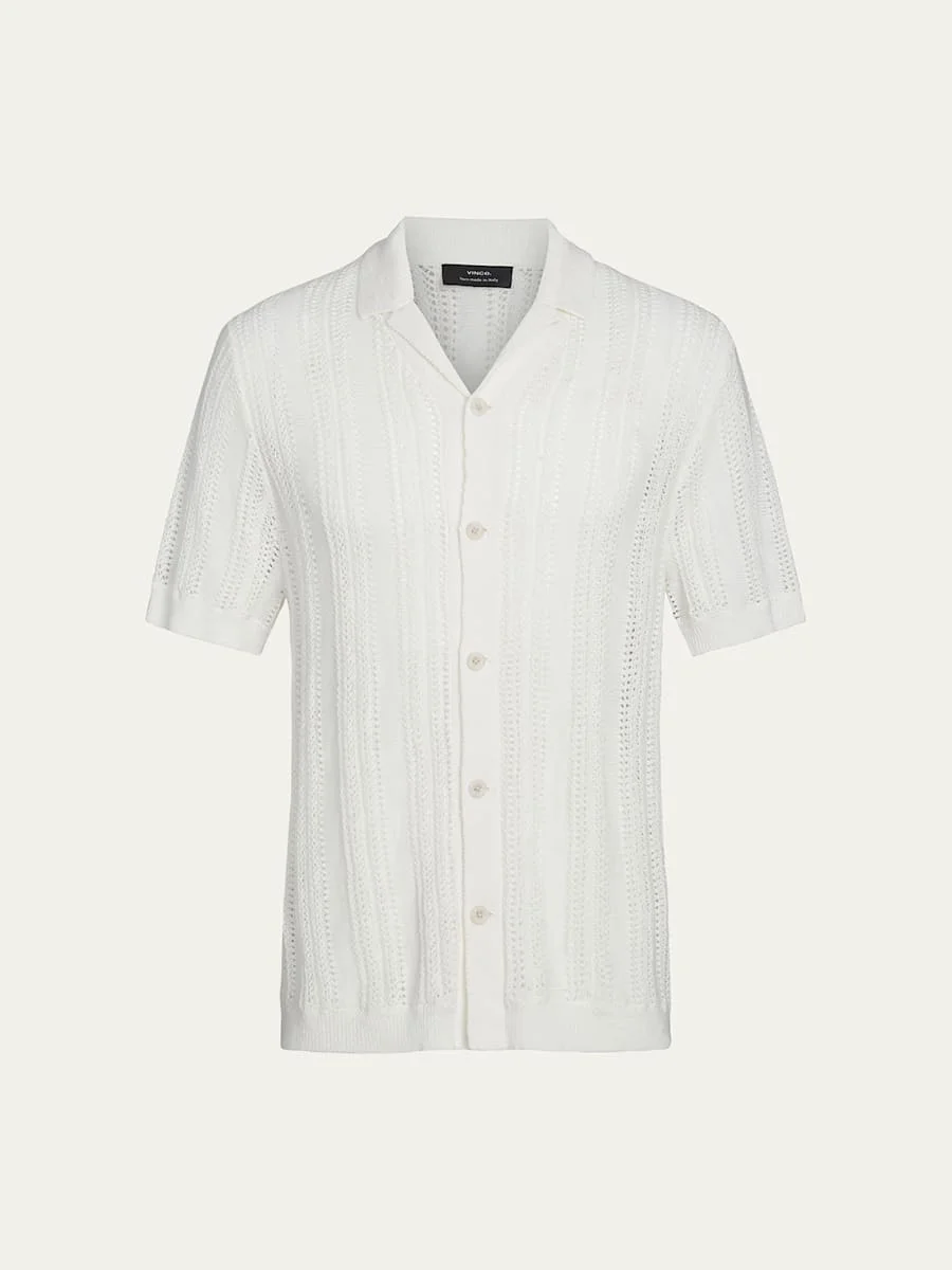 Vince cabana shirt in textural open crochet stripes Notched collar Button-front closure Short sleeves Ribbed armbands and hem Cotton/linen/polyester Hand wash or dry clean Imported Online Inquiries: BGS21_NCYL0| Store Inquiries: #4976469