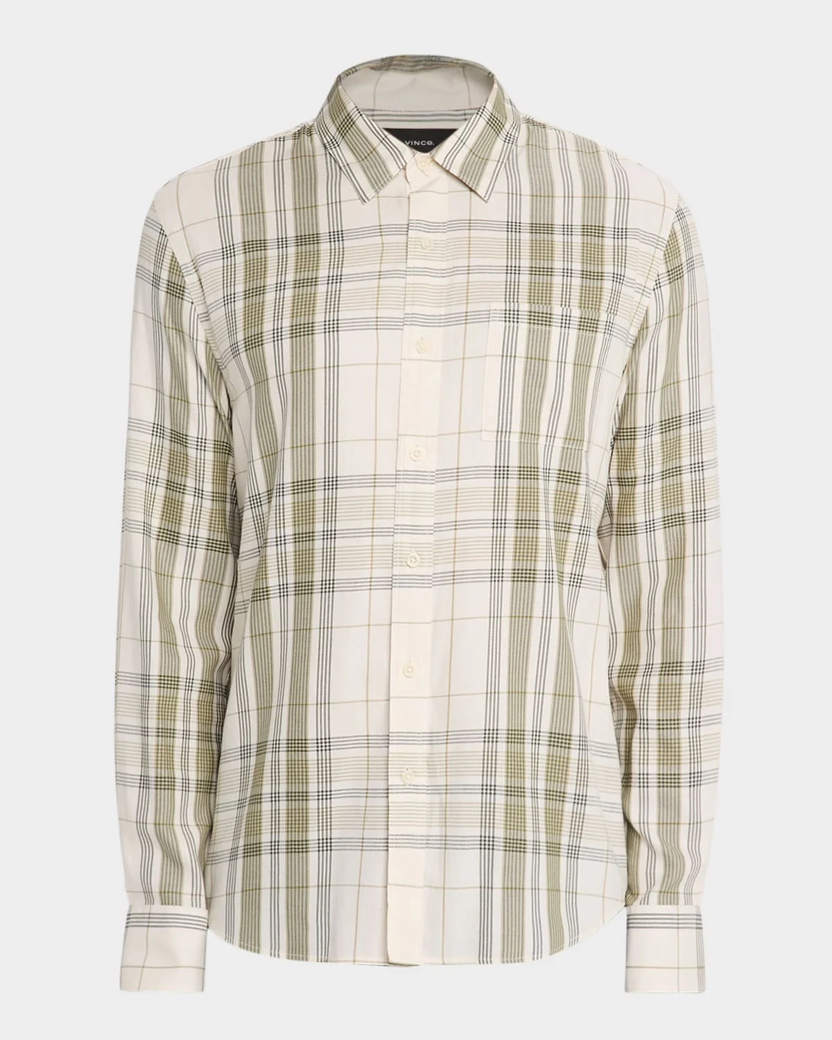 Vince classic shirt in dunluce plaid Spread collar; buttonfront Long sleeves with button cuffs Chest pockets Classic fit Cotton/rayon/cellulose acetate Machine wash cold, tumble dry Imported