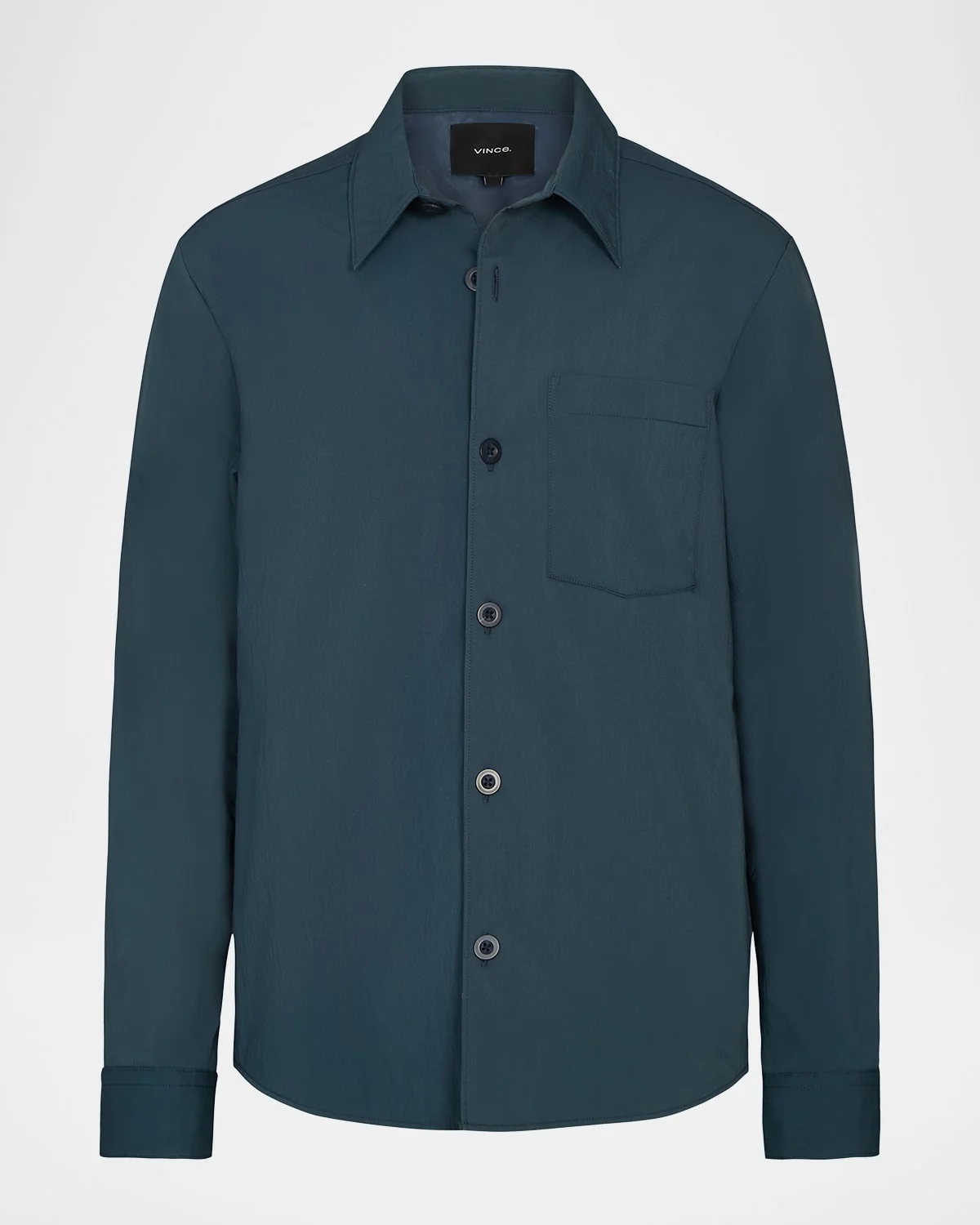 This Vince shirt jacket is crafted in softtextured technical cotton, insulated for added warmth with a weightless feel. Point collar Buttonfront Patch chest pocket Singlebutton barrel cuffs Curved hem Classic fit Cotton/nylon/polyamide/spandex Nylon lining Polyester fill Machine wash cold Imported
