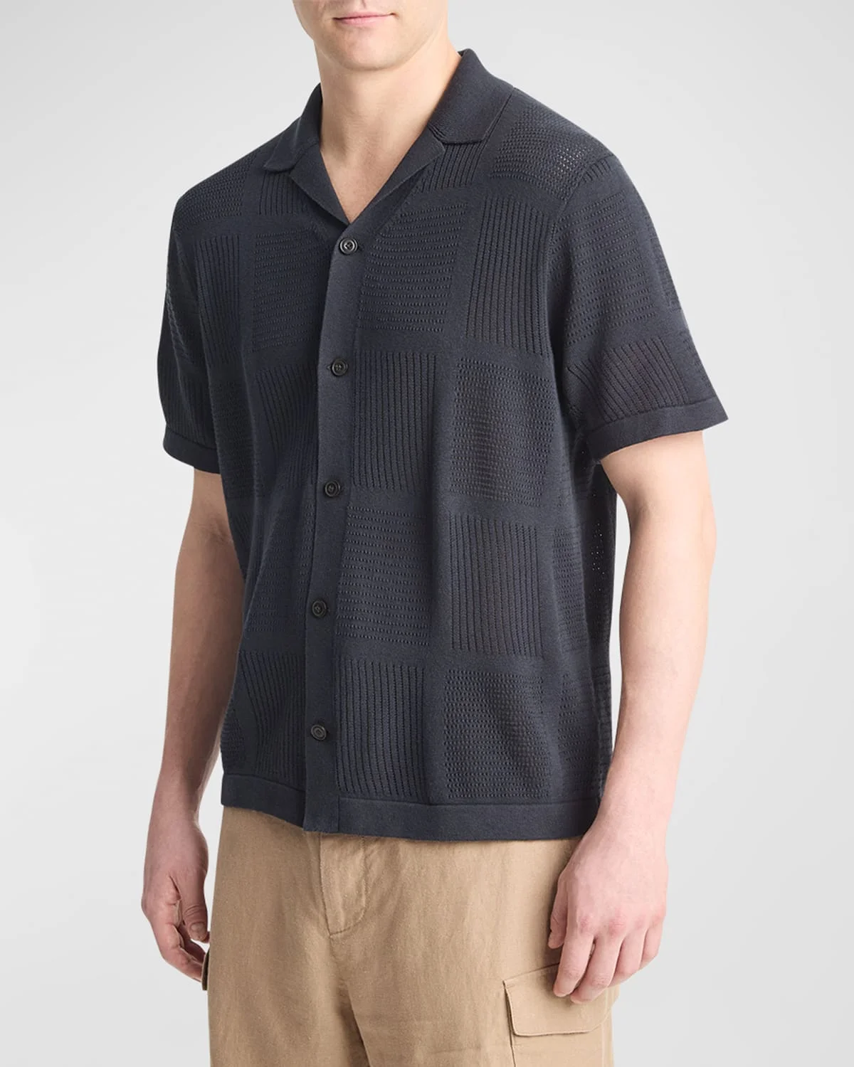 - Vince shirt with patchwork pointelle construction - Camp collar - Button closure - Short sleeves - Classic fit - Cotton - Hand wash - Imported - Model is 6'1"/185cm.