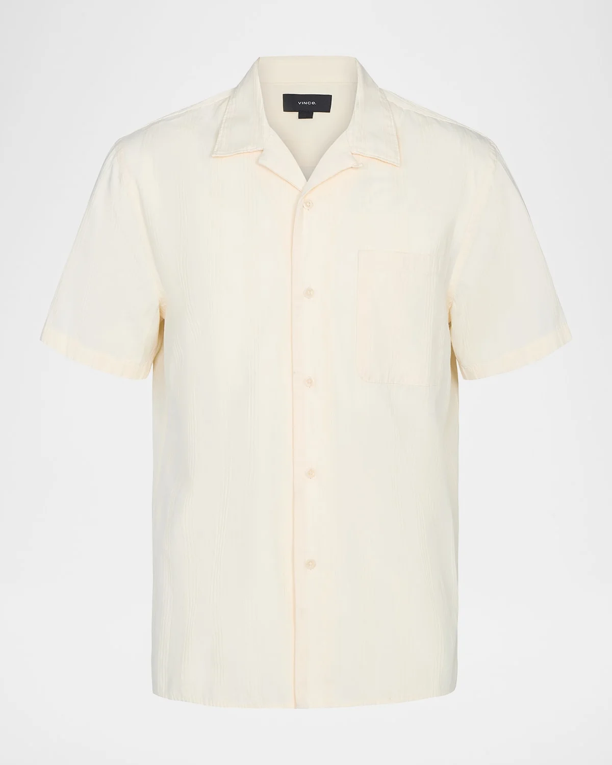 Designed with warmweather escapes in mind, the Vince camp shirt is crafted from 100% cotton and finished with a tonal raised stripe for subtle texture. Buttonandloop notch collar Button front Patch chest pocket Vented sides Straight hem Classic fit Cotton Machine wash warm Imported