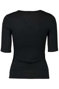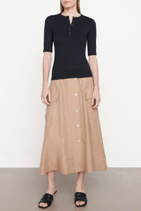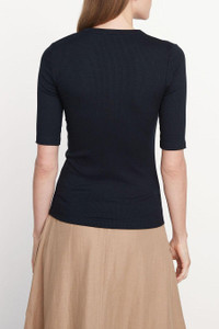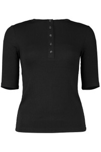 DETAILS AND INSIGHT Vince rib elbow sleeve henley in black. 92% Modal, 8% Spandex Machine Wash Cold Made in Vietnam Style V919784166-001BLK