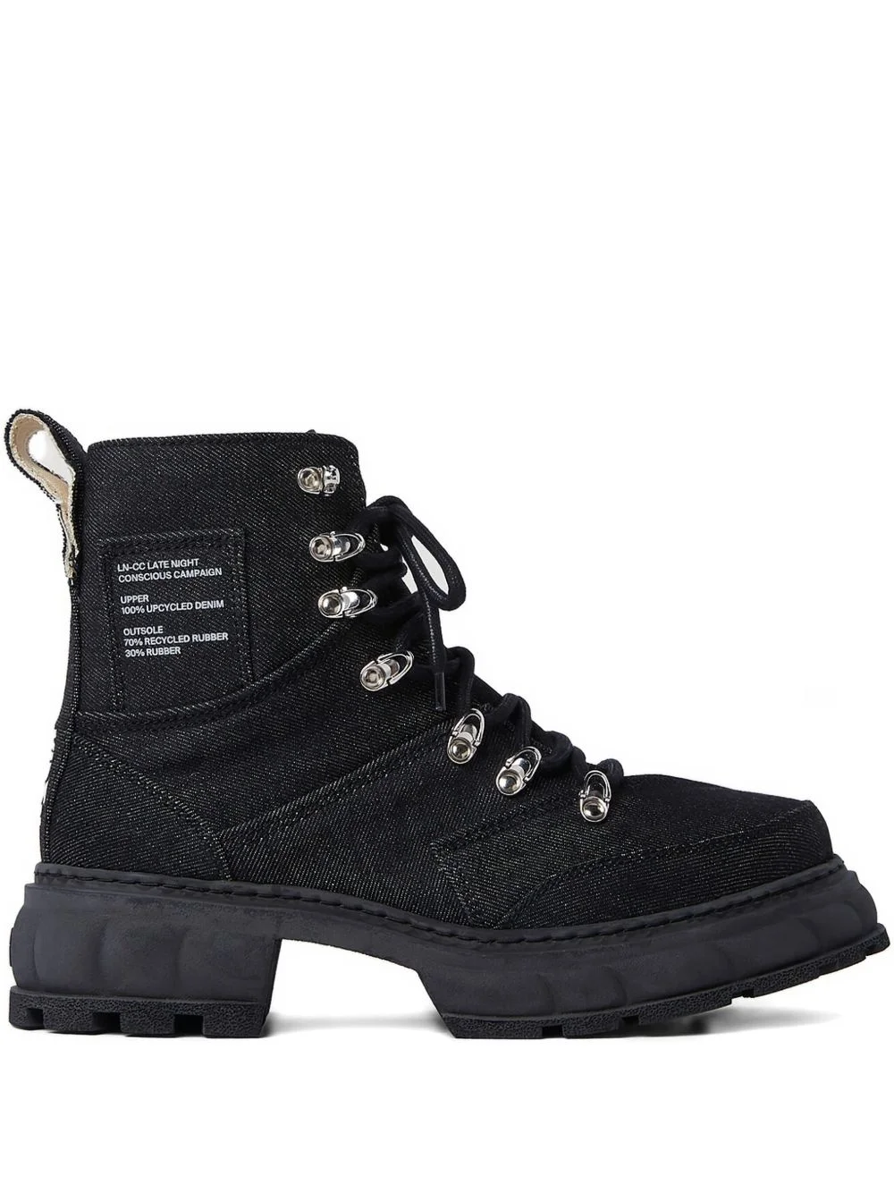 Disruptor lace-up combat boots Highlights - Black - Recycled cotton - Denim weave - Lace-up fastening - Padded collar - Cleated track sole - Embossed recycle-emblem heel - Round toe Imported Composition Outer: Recycled Cotton 100% Lining: Fabric 100% Sole: Rubber 100%