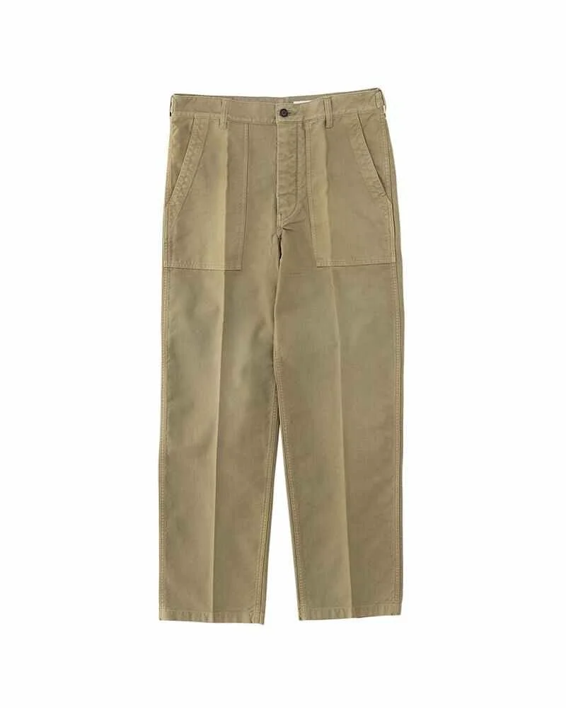 ALDA PANTS COLOR: NAVY, OLIVE, KHAKI SIZE: 1, 2, 3, 4, 5 Work pants made from super long staple cotton Garment dyed Damage processed Original vegetable ivory buttons 100% Cotton SIZE 1 : Waist 32.3 , Inseam 29.4 , Thigh width 12.6 , Hem width 7.9 (inch) SIZE 2 : Waist 34.3 , Inseam 30.2 , Thigh width 13 , Hem width 8.4 (inch) SIZE 3 : Waist 36.2 , Inseam 31 , Thigh width 13.5 , Hem width 8.9 (inch) SIZE 4 : Waist 38.2 , Inseam 31.7 , Thigh width 14 , Hem width 9.3 (inch) SIZE 5 : Waist 40.2 , Inseam 32.5 , Thigh width 14.4 , Hem width 9.8 (inch) Please be aware that the fabric used may vary in color and pattern from item to item. Products may shrink slightly when washed.