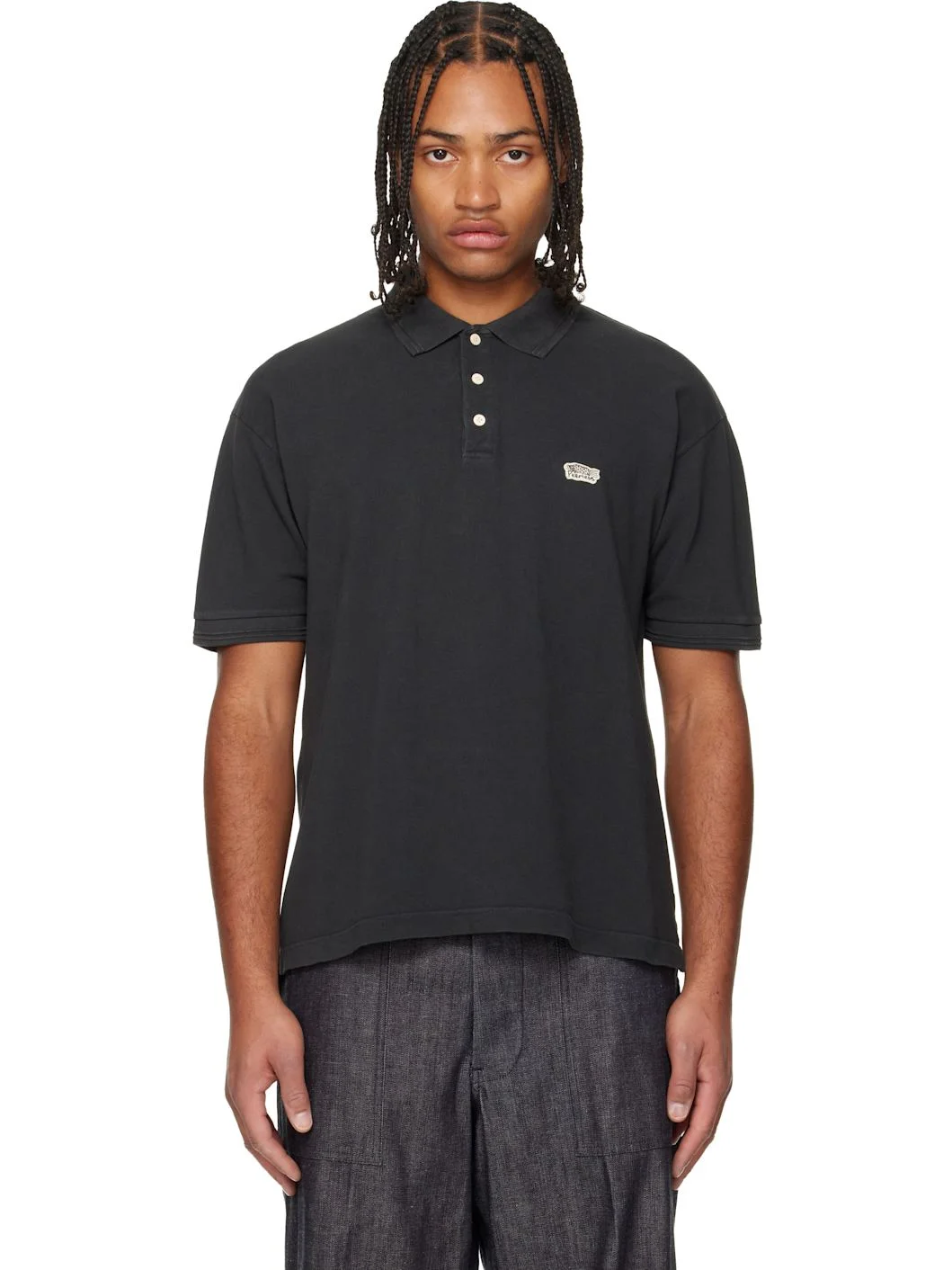 Cotton pique polo. · Rib-knit spread collar and cuffs · Three-button placket · Embroidered graphic patch at chest · Tennis-tail hem Supplier color: Black 100% cotton. Made in Japan 252487M212000