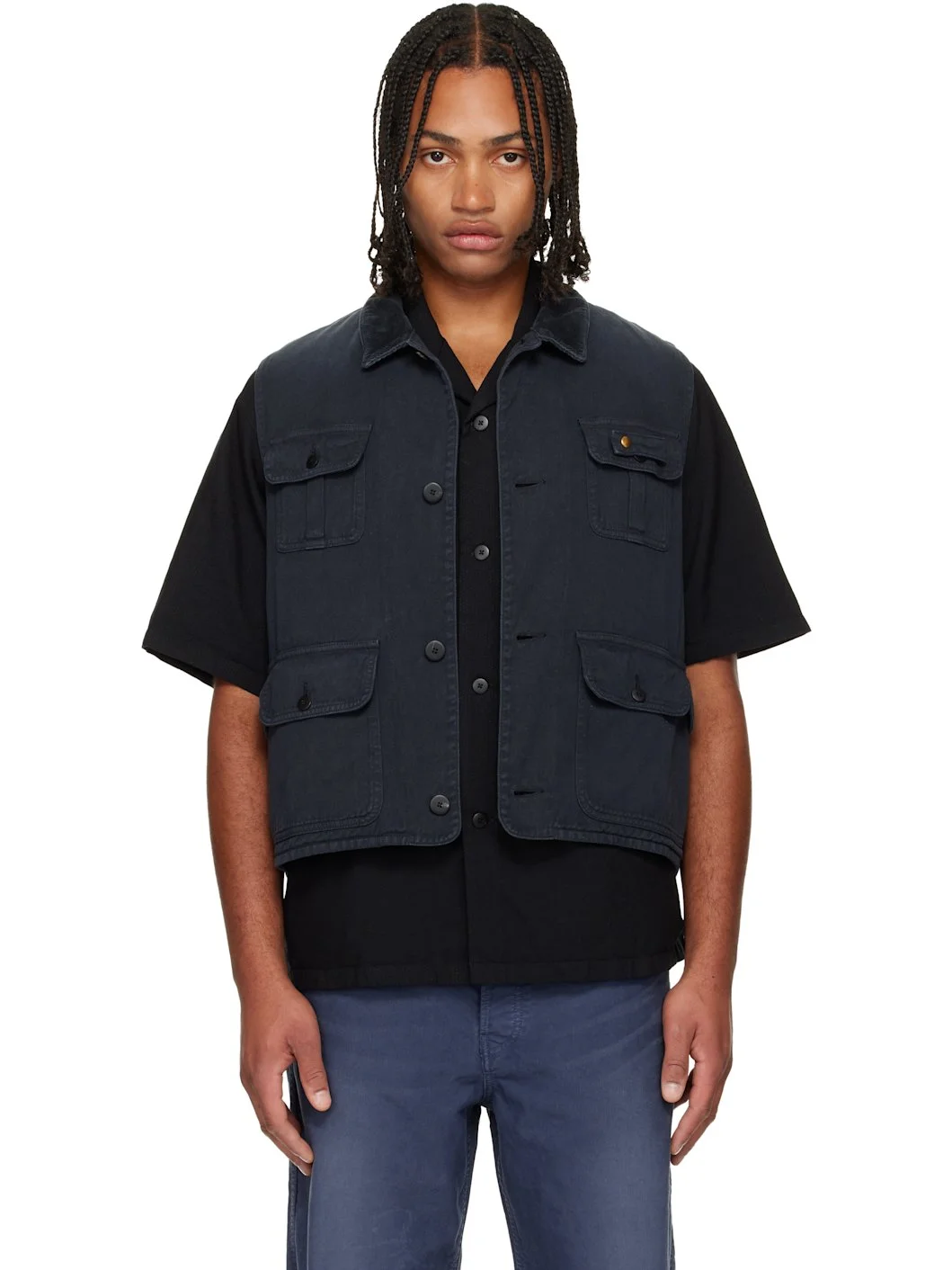 Non-stretch denim vest. · Subtle fading throughout · Corduroy spread collar · Button closure · Flap pockets at front and back Supplier color: Black 100% cotton. Made in Japan 252487M185000